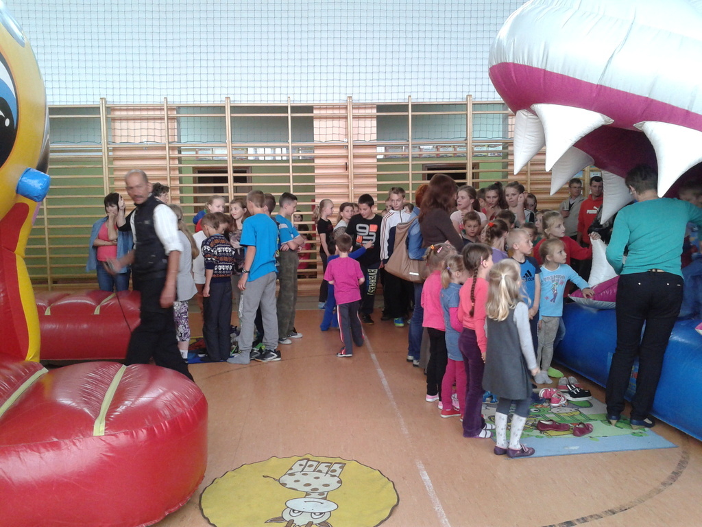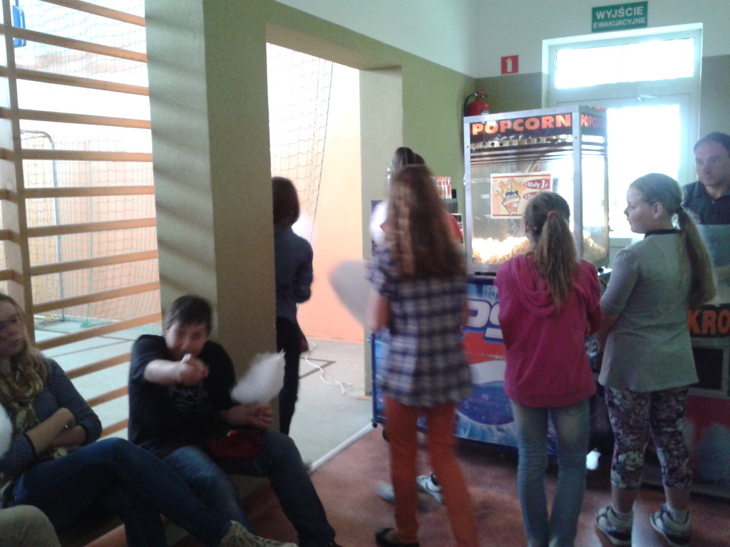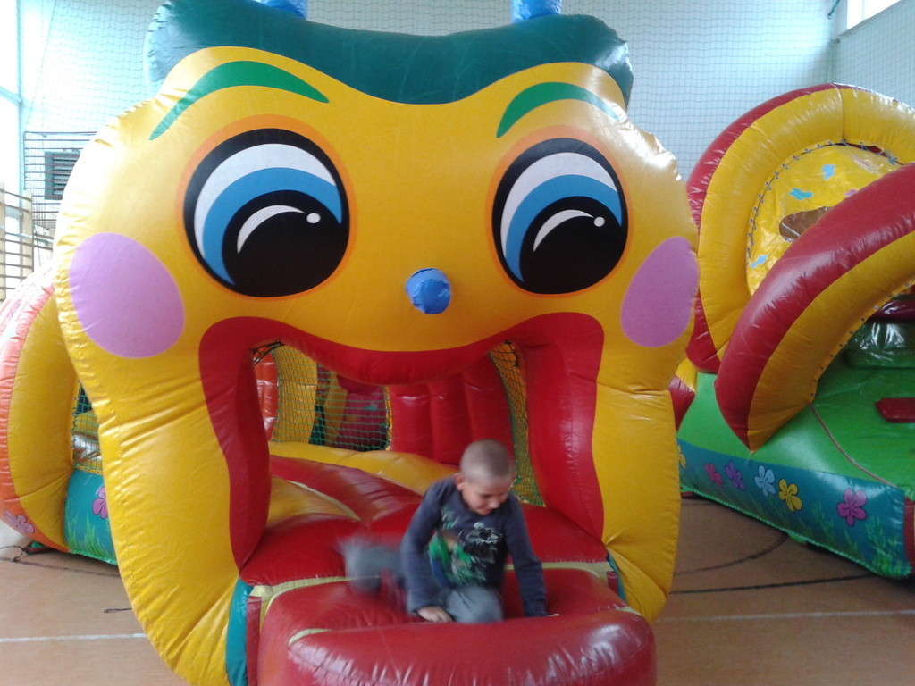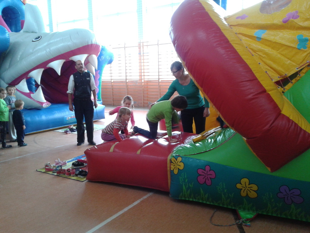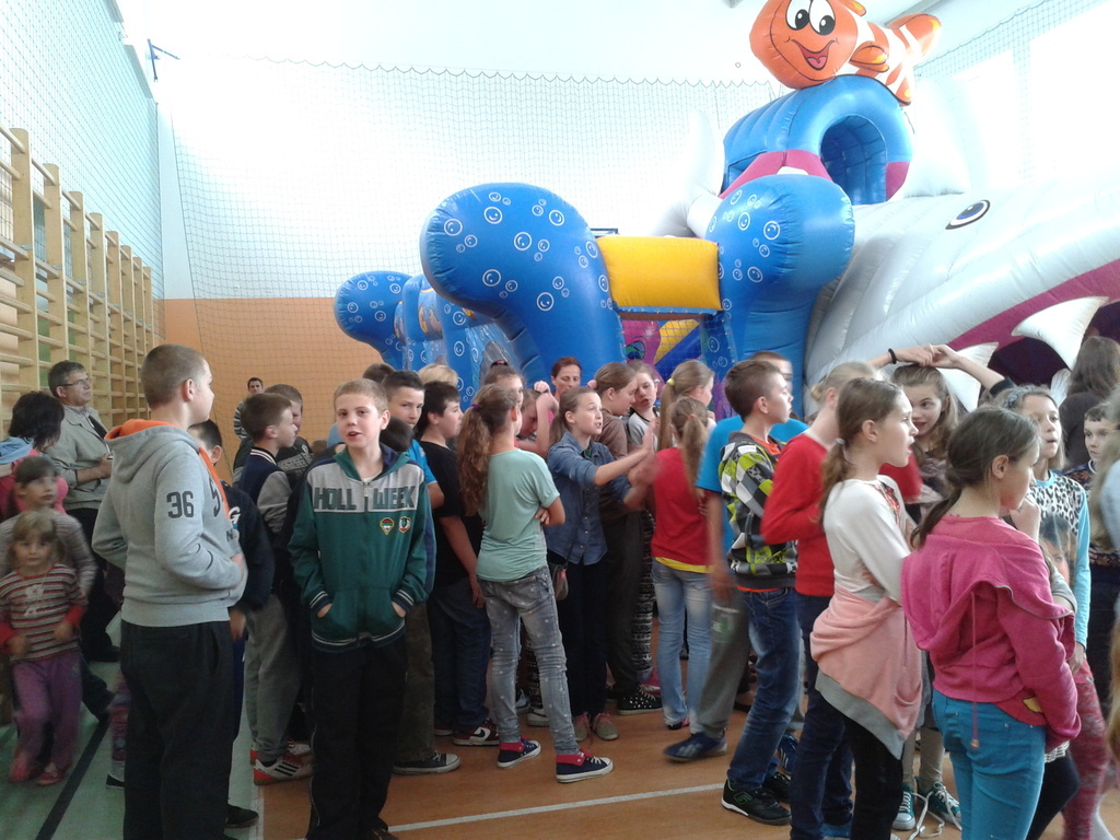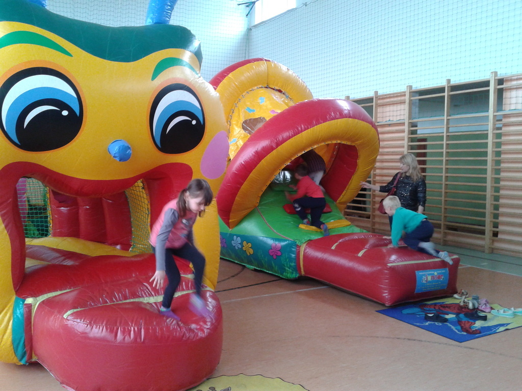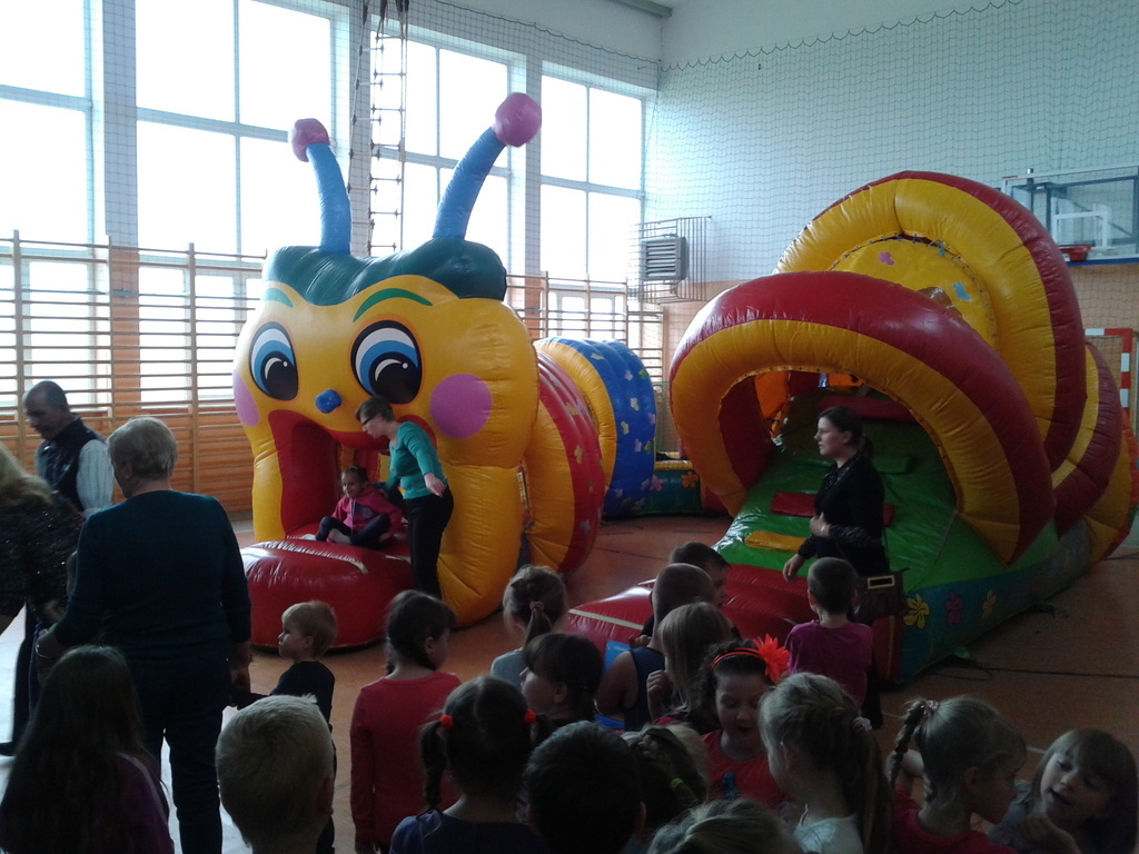 Pomimo nie sprzyjającej pogody zabawa trwała w najlepsze. Na sali gimnastycznej zostały zainstalowane dmuchane zjeżdżalnie, które cieszyły się ogromnym zainteresowaniem dzieci. Tuż obok można było dostać watę cukrową, kupić popcorn czy pepsi. Nasza stołówka serwowała hot-dogi, były też owoce i napoje. Nie zabrakło także innych atrakcji, np. można było grać w szachy, oglądać bajki i filmy oraz wziąć udział w turnieju tenisa stołowego (wśród chłopców z gimnazjum bezkonkurencyjny okazał się Arek Kalawski, a w podstawówce Mateusz Hajduk!). Zadowolone buzie dzieci w dniu ich święta to dowód na to, że zabawa była udana!