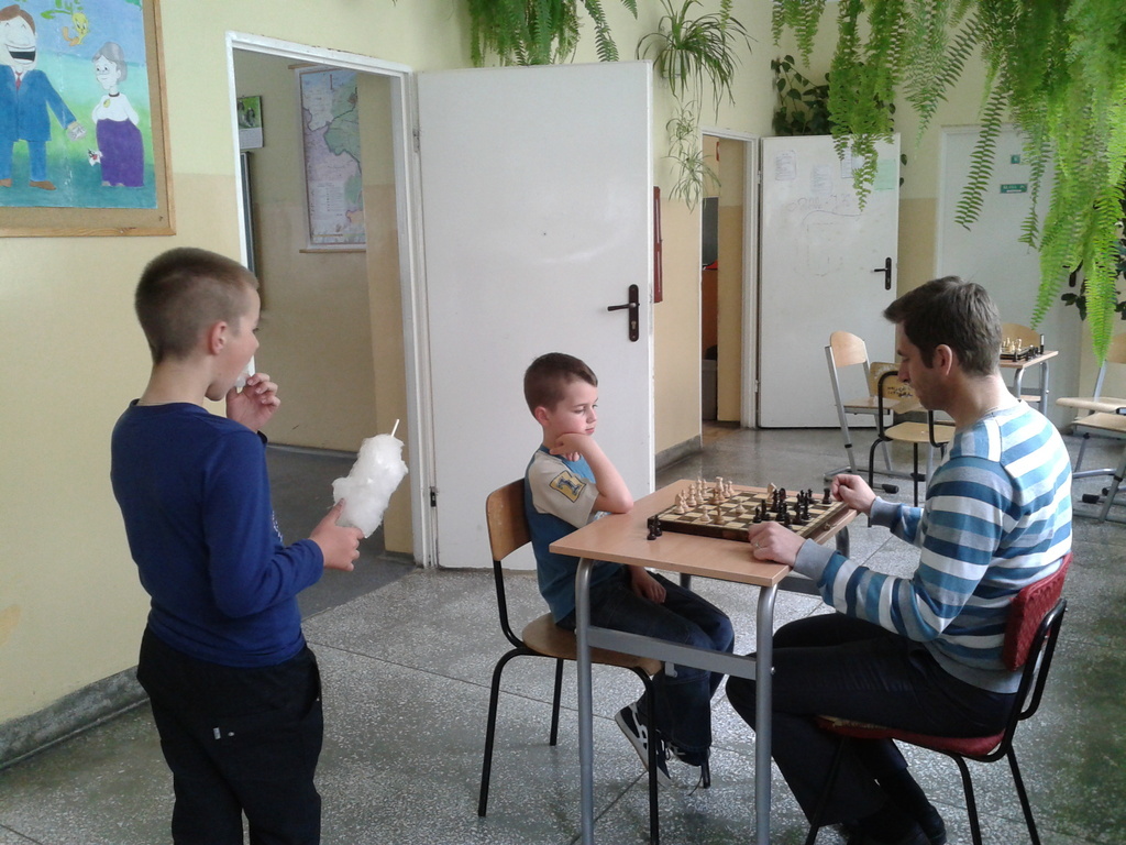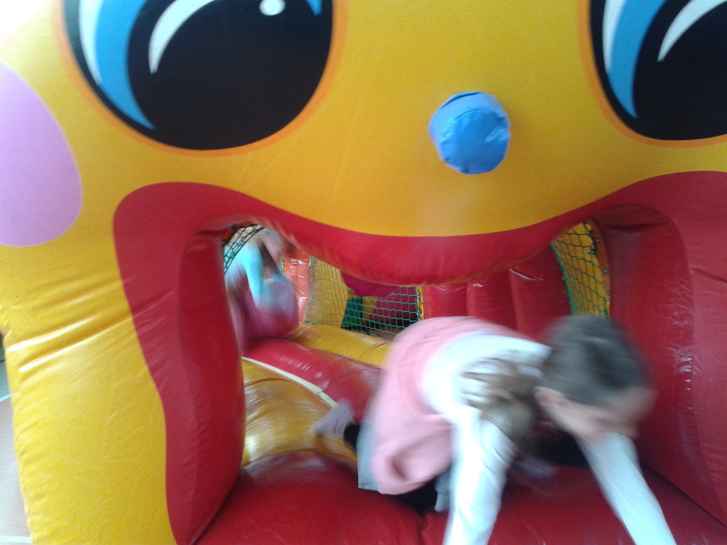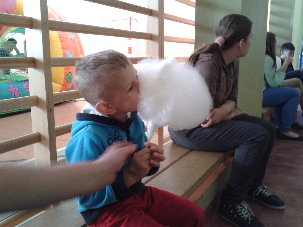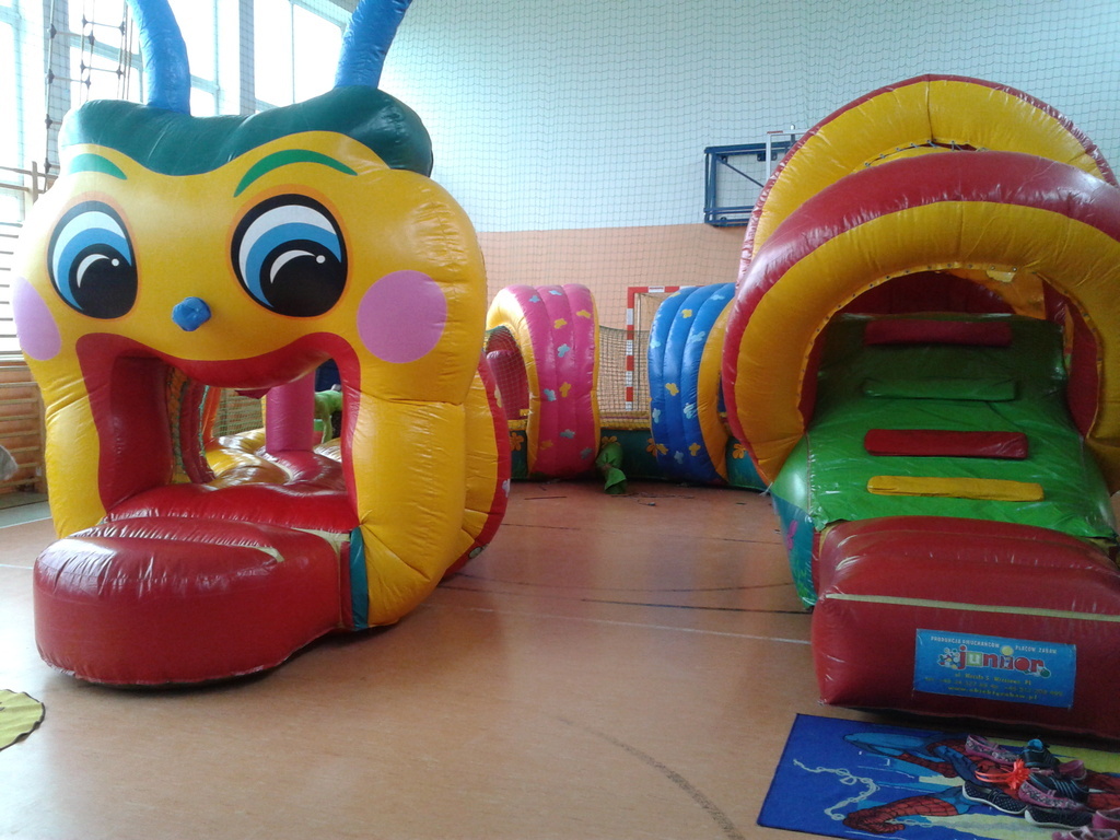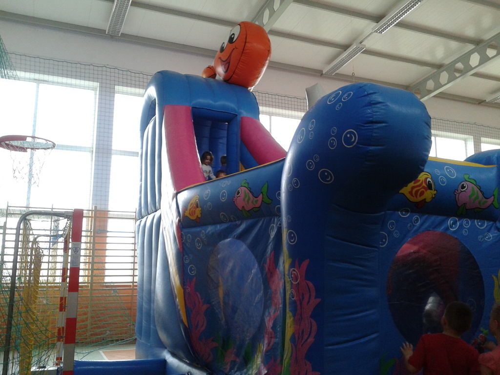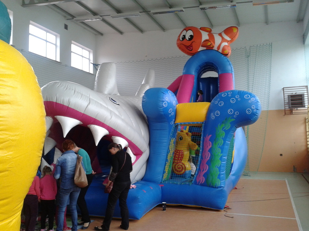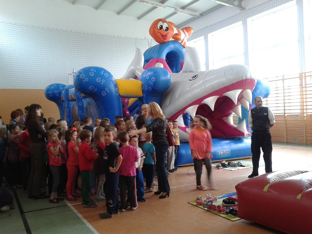 Pomimo nie sprzyjającej pogody zabawa trwała w najlepsze. Na sali gimnastycznej zostały zainstalowane dmuchane zjeżdżalnie, które cieszyły się ogromnym zainteresowaniem dzieci. Tuż obok można było dostać watę cukrową, kupić popcorn czy pepsi. Nasza stołówka serwowała hot-dogi, były też owoce i napoje. Nie zabrakło także innych atrakcji, np. można było grać w szachy, oglądać bajki i filmy oraz wziąć udział w turnieju tenisa stołowego (wśród chłopców z gimnazjum bezkonkurencyjny okazał się Arek Kalawski, a w podstawówce Mateusz Hajduk!). Zadowolone buzie dzieci w dniu ich święta to dowód na to, że zabawa była udana!