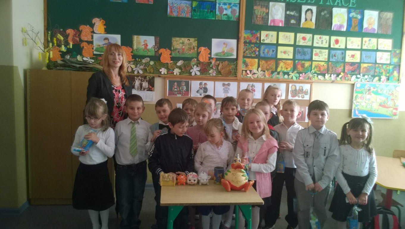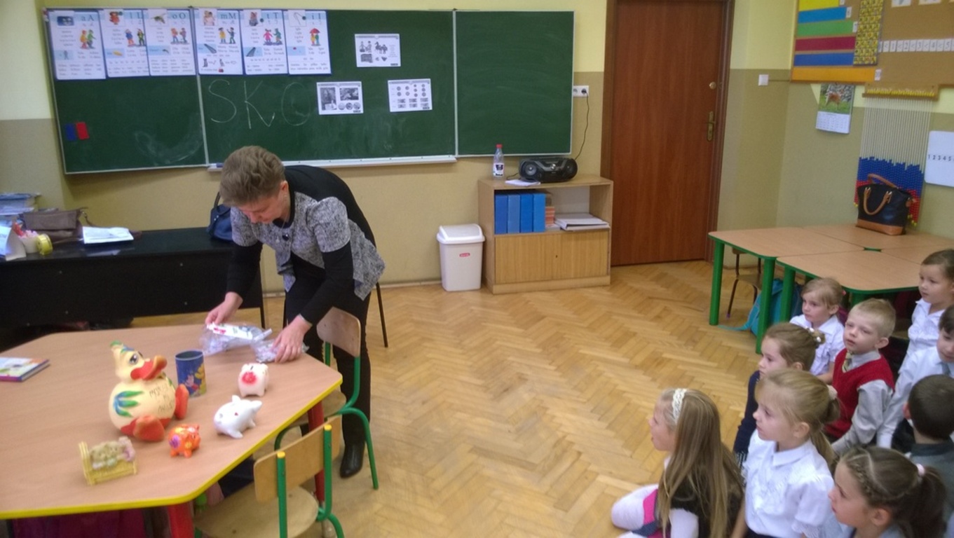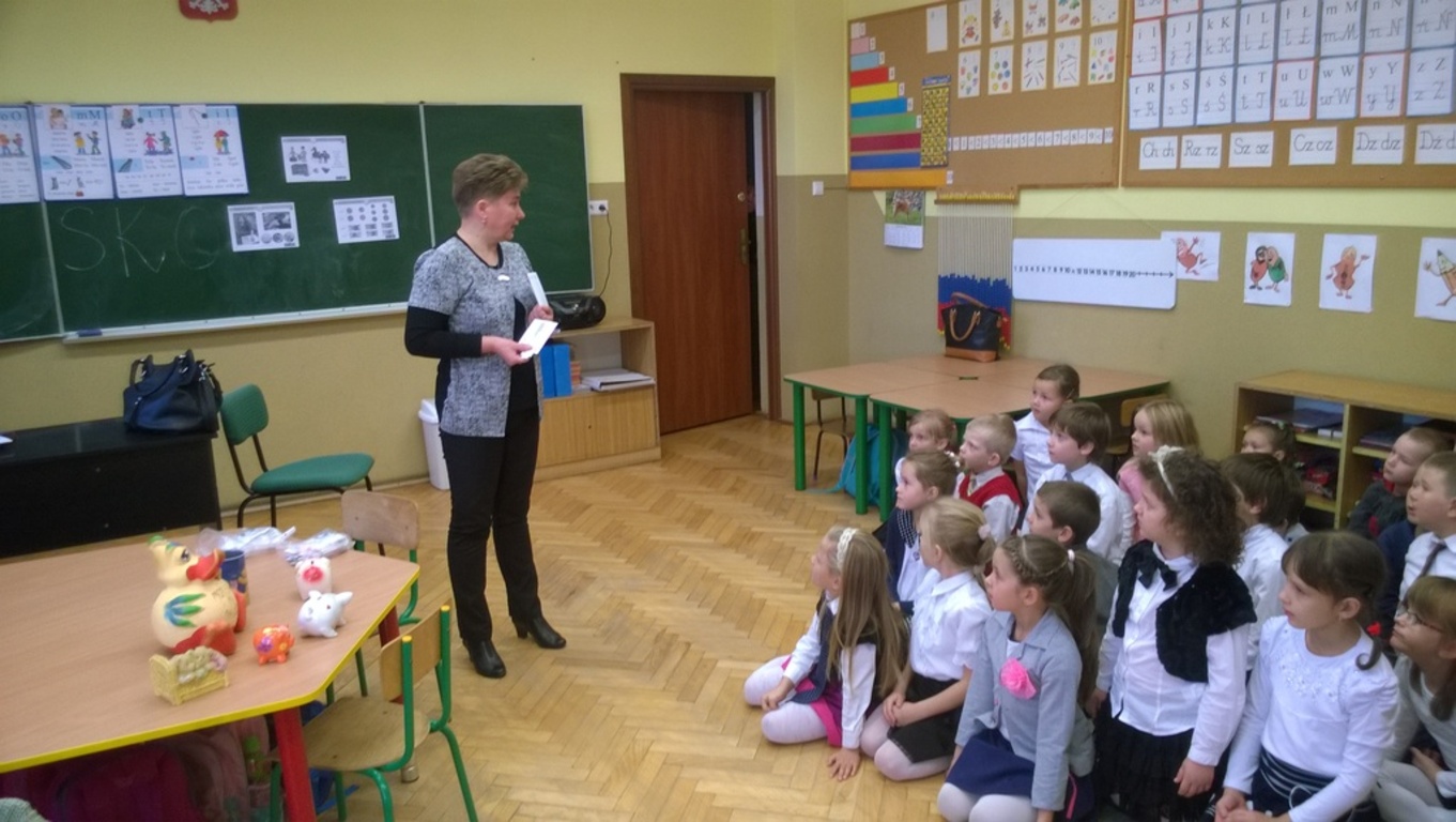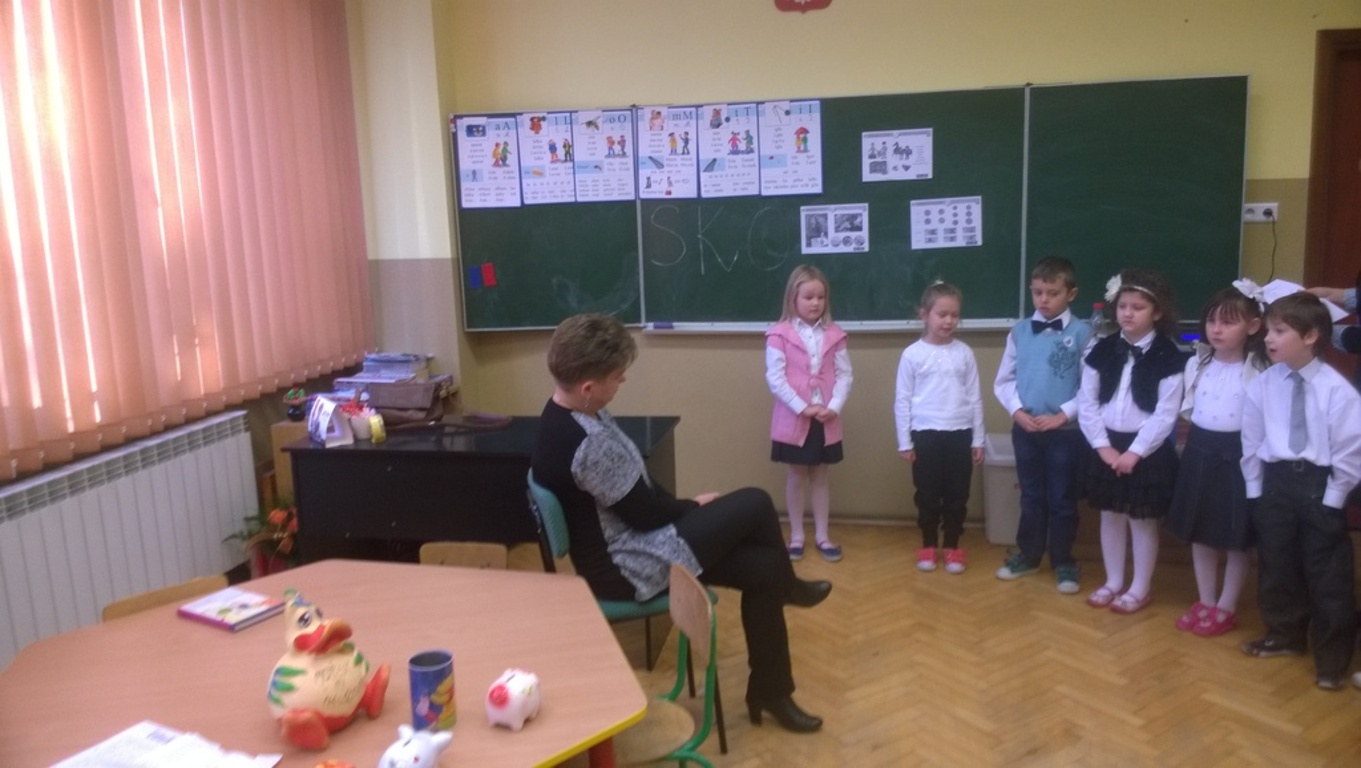 29 października 2014r. klasy IA i IB odwiedziła pani dyrektor Banku Spółdzielczego w Stubnie Mariola Świdrak. Wspólnie z dziećmi odkrywała świat pieniądza i zachęcała do oszczędzania. Dzieci przygotowały kilka wierszy i piosenkę o oszczędzaniu. Przyniosły również swoje skarbonki. Punktem kulminacyjnym spotkania było rozdanie przez panią Dyrektor książeczek SKO dla każdego dziecka z wkładem 10 zł oraz drobnych upominków. Po bardzo ciekawej lekcji wszystkie dzieci zdeklarowały się oszczędzać pieniądze w SKO. Serdecznie podziękowały pani Marioli za miłe spotkanie wręczając jej bukiet kwiatów.