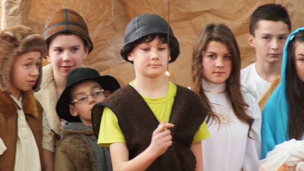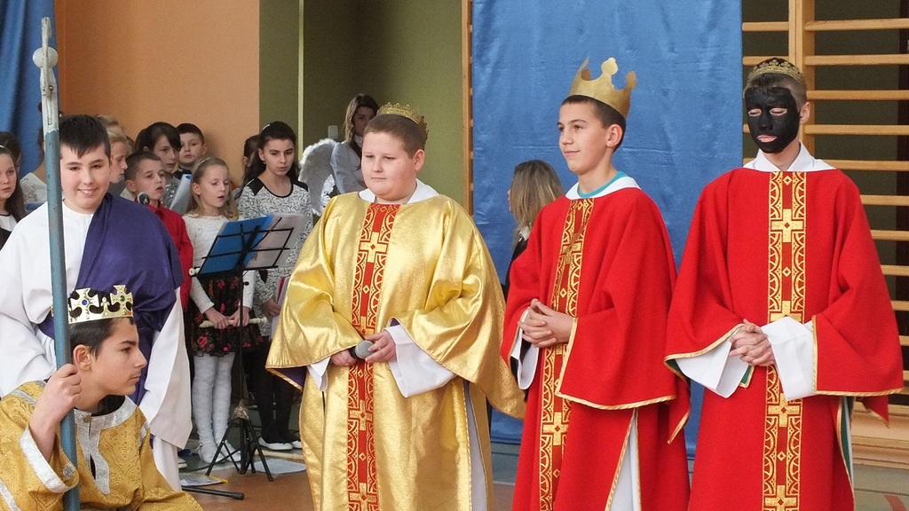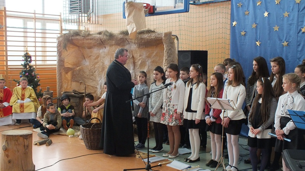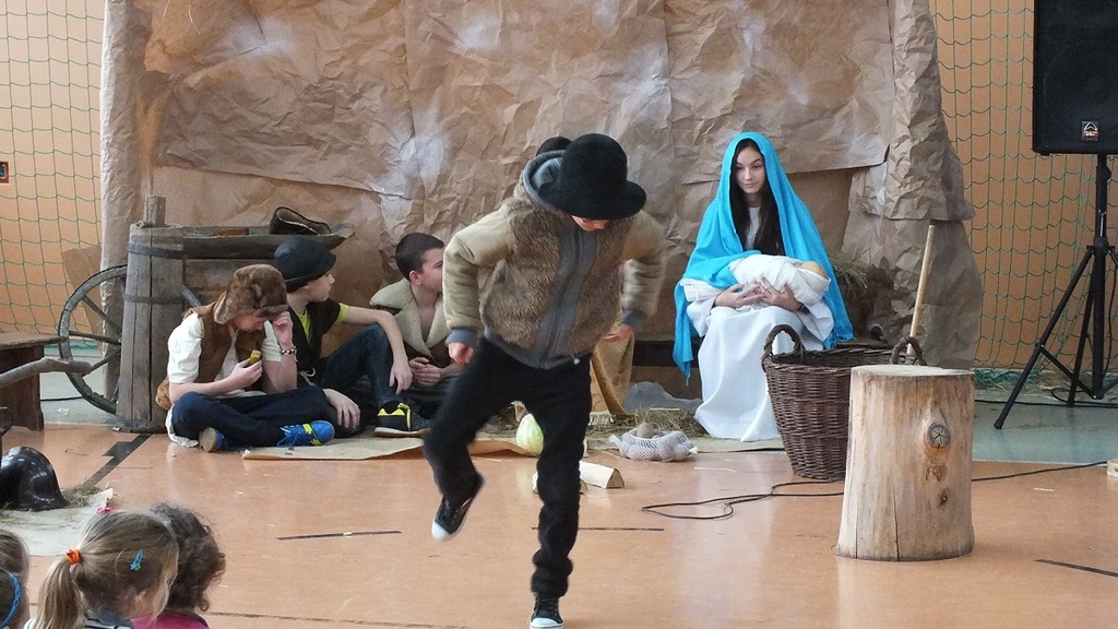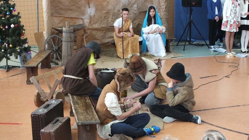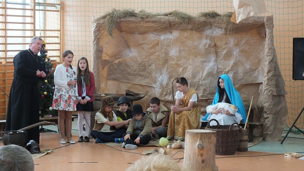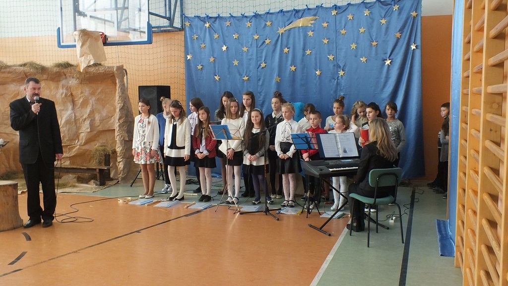 Piękną tradycją naszej szkoły jest wspólne dzielenie się opłatkiem i prosforą. Zanim 5 stycznia 2015r. p.dyrektor Stanisław Kalawski złożył pierwsze życzenia, młodzież kolędowała w dwóch językach i wystawiła Jasełka. Zebrani na sali uczniowie, nauczyciele, pracownicy szkoły, rodzice i zaproszeni goście ( dziękujemy za przybycie m.in. p. Januszowi Słabickiemu- wójtowi gminy Stubno, p. Marioli Świdrak- dyrektorce Banku Spółdzielczego w Stubnie, p. Renacie Sydorów - prezesowi stowarzyszenia " Blizej Siebie" z Kalnikowa, p. Marzenie Hasiuk- przewodniczacej Rady Rodziców i p. Elżbiecie Mac- emerytowanej nauczycielce naszej szkoły) modlili się wraz z księżmi Bogusławem Kotem i Bazylem Zabrockim. Chór do kolędowania znakomicie przygotowała p. Beata Grabas . Pomagali jej p. Swietłana Szczurek i występujący wraz z uczniami ksiądz Bazyl Zabrocki! Wszystkich oglądających szczególnie ujął występ Magdy Polny, Jakuba Chomy i Wojtka Zabłockiego. Podziękować należy klasie I gimnazjum, którzy pod opieką p. Bogusława Kosztyły " zaliczyli" dobry występ ( charakteryzowaniem aktorów zajęły się Sandra Dacko, Ewa Hajduk i Dominika Grabas). Podziękowania również dla zaprzyjaźnionego ze szkołą Tomasza Kalawskiego za obsługę techniczą występów. Jak zwykle wyróżniły się panie z Rady Rodziców przygotowując Wigilię. Wesołych Świąt i do zobaczenia w szkolnym Betlejem za rok.