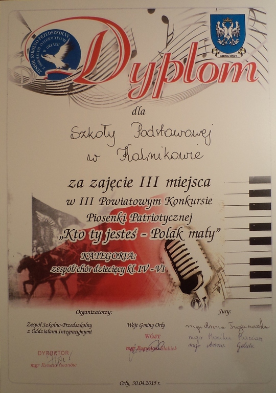 30 kwietnia 2015 r. w Zespole Szkół w Orłach odbył się III Powiatowy Konkurs Piosenki Patriotycznej ,,Kto ty jesteś - Polak mały". Naszą szkołę zaprezentował chór uczniów klas 4, 5 i 6 pieśniami wojskowymi ,,Białe róże" i ,,Kalina malina" w wykonaniu 2-głosowym, pod kierunkiem p. Beaty Grabas. Uczniowie zdobyli III miejsce, otrzymali statuetkę, dyplomy i drobne upominki. Wyjazd na konkurs pełen był wielu wrażeń, doskonałą lekcją patriotycznej postawy i zdobywaniem kolejnych doświadczeń artystycznych. Gratulacje dla chóru!