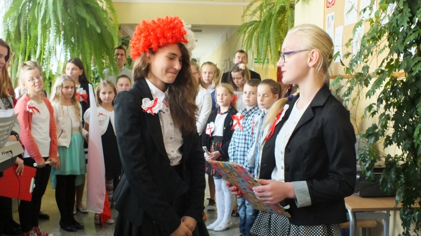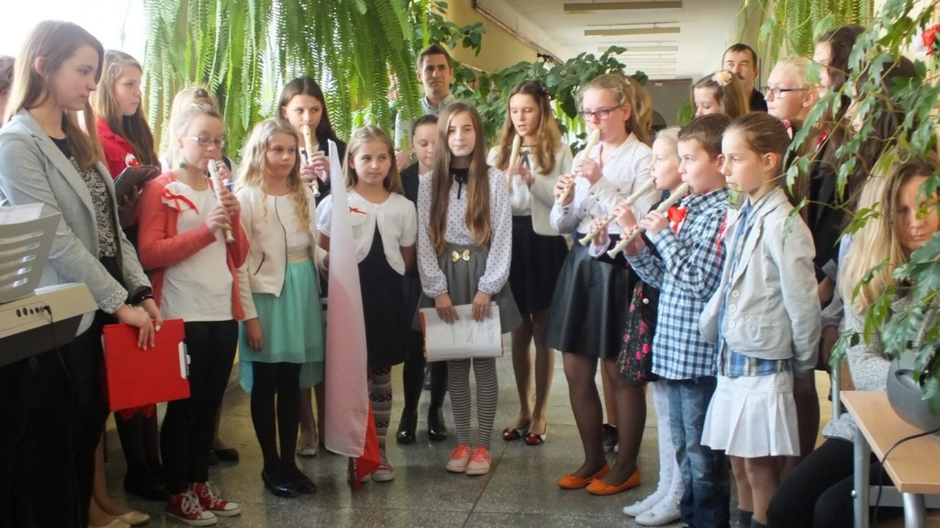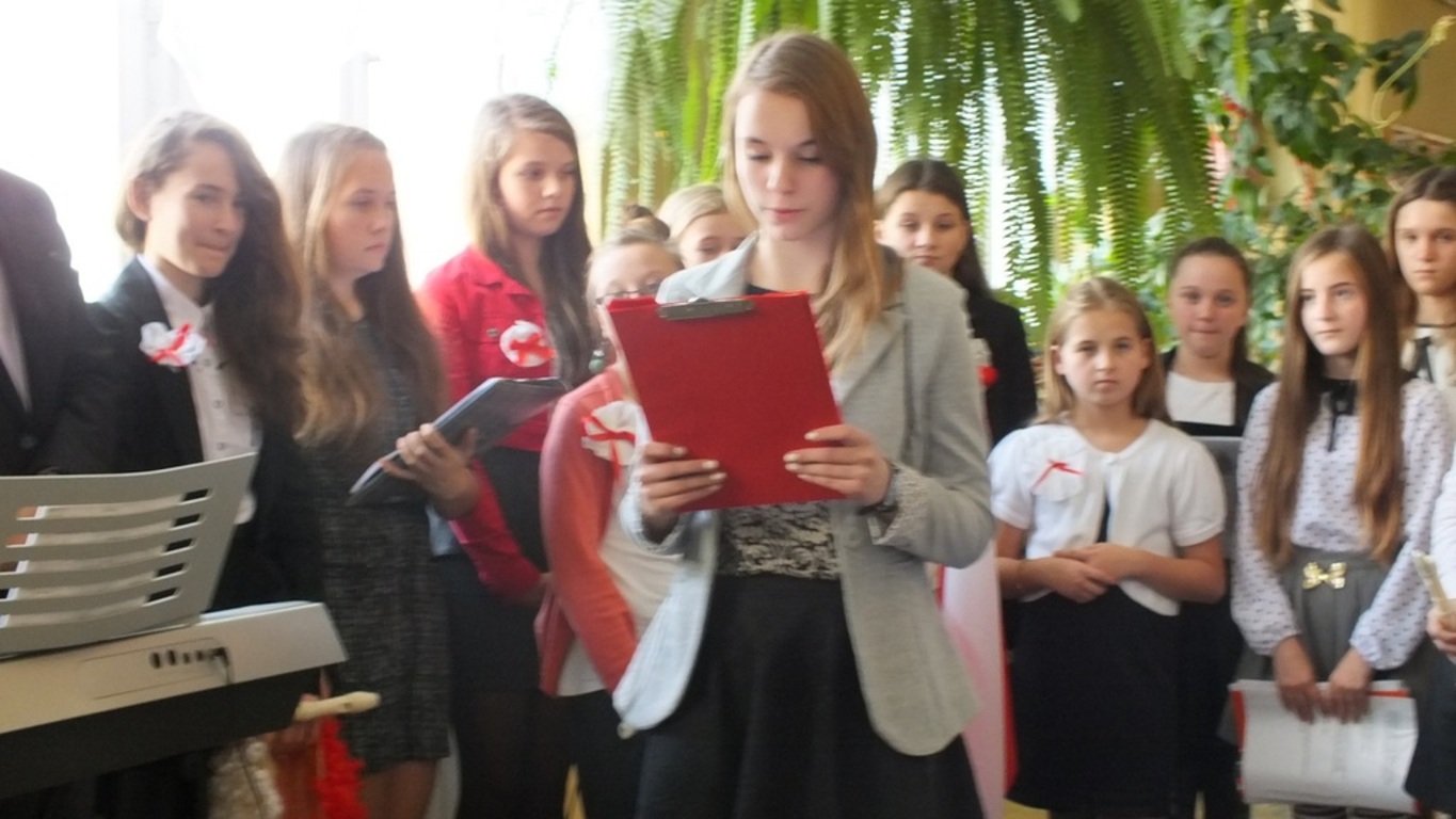 "Niepodległość - trudne słowo"- to pieśń, po której wszystkim uczestnikom apelu ( 13.11.2015r.) przeszły ciarki po plecach. Zachwycające! Wokalistkami były Alicja Kalawska i Amelia Grabas-Kalawska. Znakomicie towarzyszył im chór i fleciści. To arcydzieło przygotowała p. Beata Grabas. Serdecznie dziękujemy. Ciesząc sie z Dnia Niepodległości słuchaliśmy wierszy ( m.in. " Kto ty jesteś?" zapytała Kalina Pekaniec swojego brata Józefa). Przede wszystkim z II gimnazjum i p. Marią Świszcz śpiewaliśmy pieśni patriotycznie. Było uroczyście , sympatycznie i z kotylionami. Dzieki Krzysiowi Sadowemy śpiewaliśmy dłużej niż przewidywał scenariusz. Na koniec artystom podziękował dyrektor szkoły p. Stanisław Kalawski.