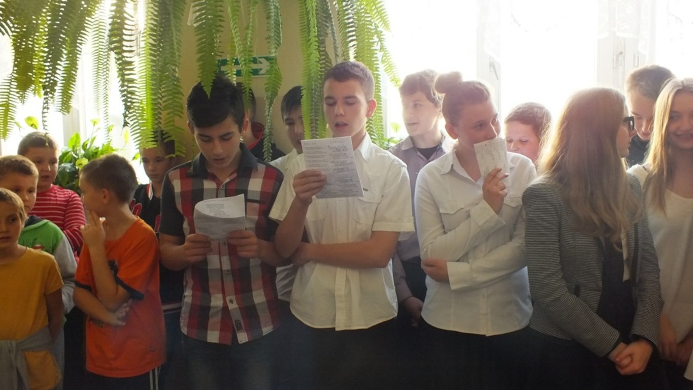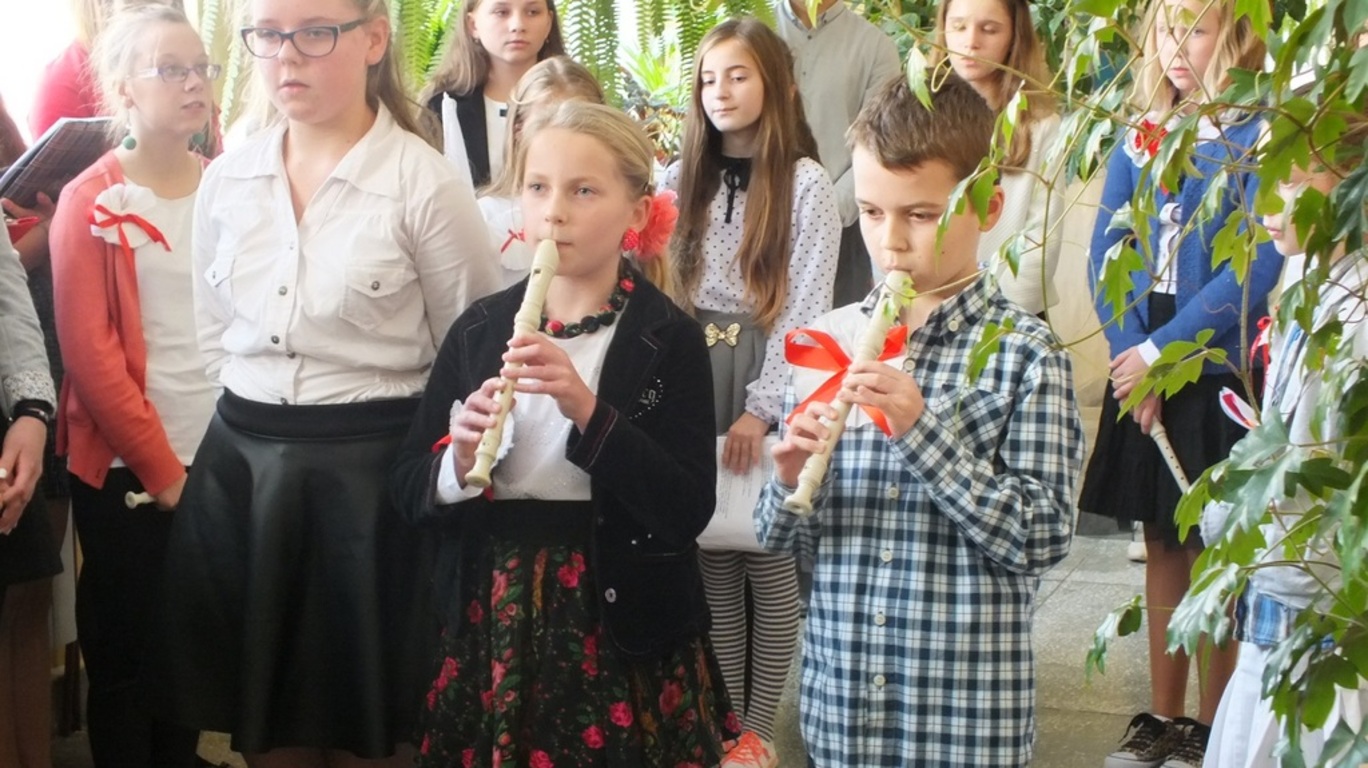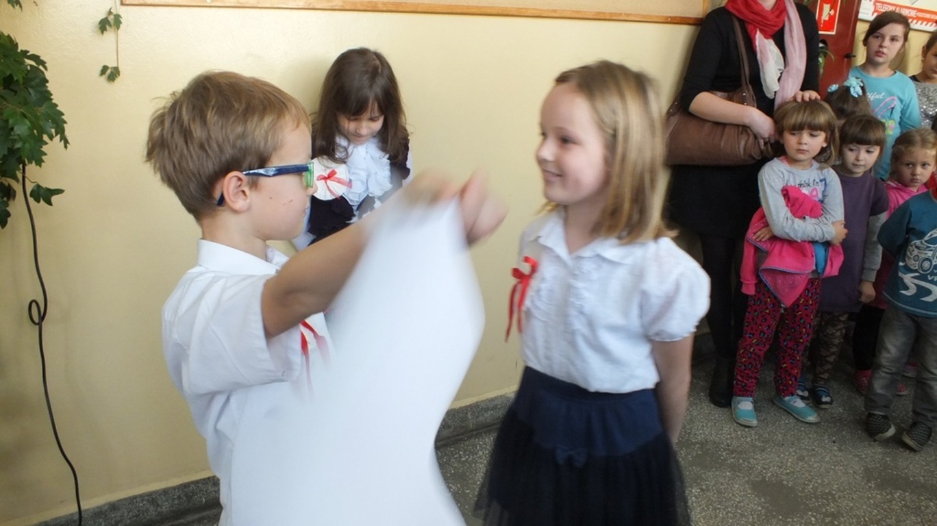 "Niepodległość - trudne słowo"- to pieśń, po której wszystkim uczestnikom apelu ( 13.11.2015r.) przeszły ciarki po plecach. Zachwycające! Wokalistkami były Alicja Kalawska i Amelia Grabas-Kalawska. Znakomicie towarzyszył im chór i fleciści. To arcydzieło przygotowała p. Beata Grabas. Serdecznie dziękujemy. Ciesząc sie z Dnia Niepodległości słuchaliśmy wierszy ( m.in. " Kto ty jesteś?" zapytała Kalina Pekaniec swojego brata Józefa). Przede wszystkim z II gimnazjum i p. Marią Świszcz śpiewaliśmy pieśni patriotycznie. Było uroczyście , sympatycznie i z kotylionami. Dzieki Krzysiowi Sadowemy śpiewaliśmy dłużej niż przewidywał scenariusz. Na koniec artystom podziękował dyrektor szkoły p. Stanisław Kalawski.