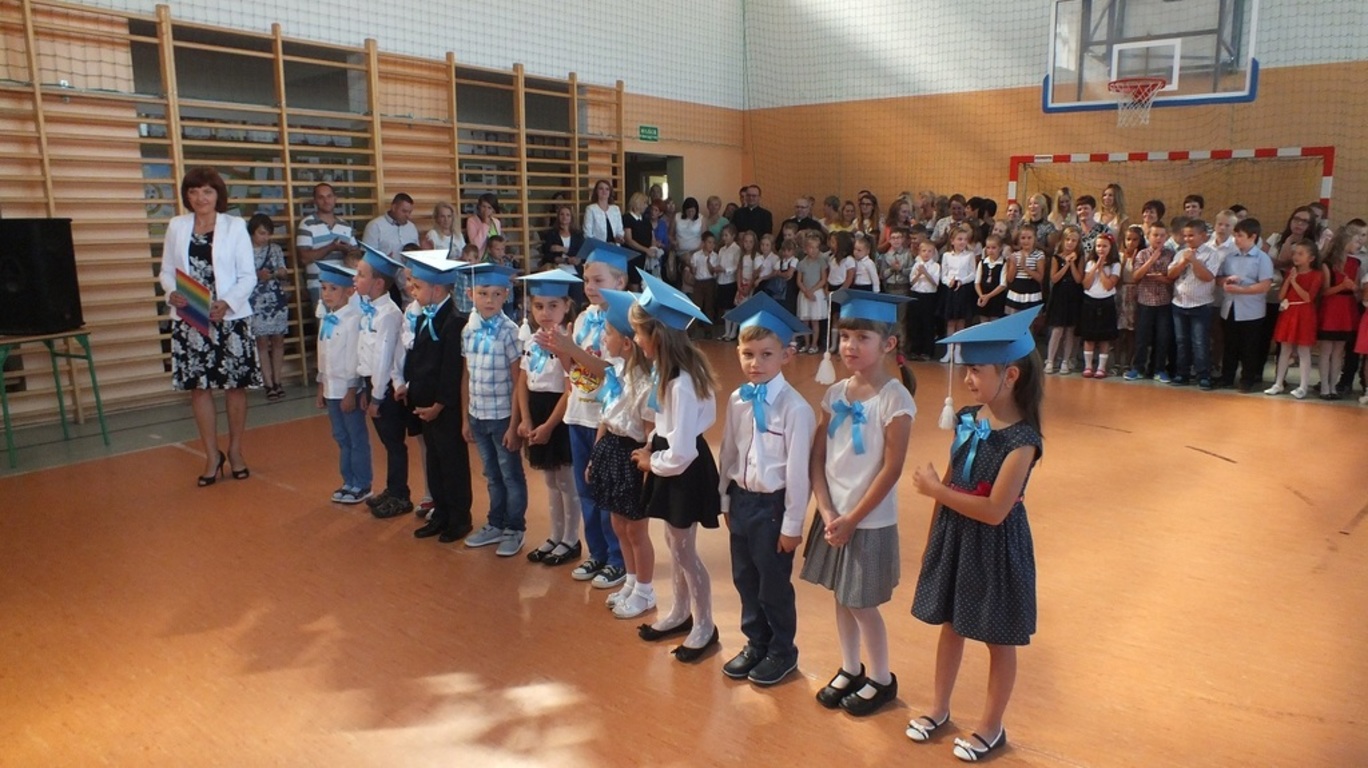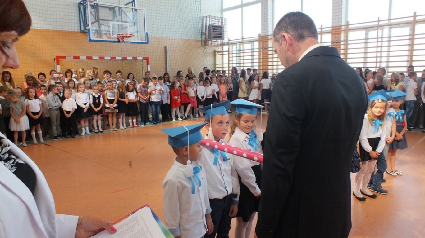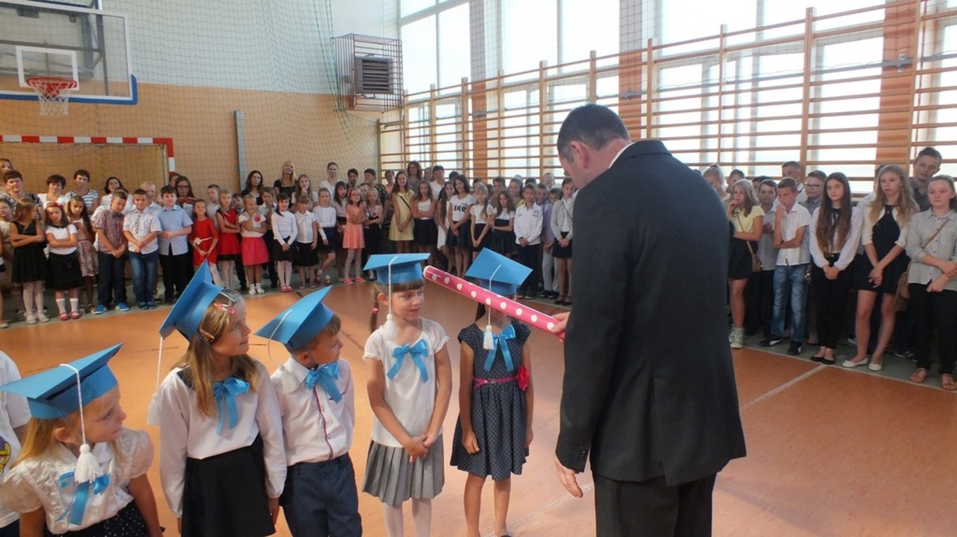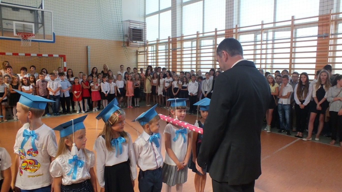 Z góry po raz pierwszy "patrzyła" na nas kamera ze szkolnego systemu monitoringu. Nagrywała uśmiechnietych ludzi, którzy z radością wrócili po wakacjach do szkoły. Głównymi bohaterami uroczystości byli pierwszoklasiści. Pięknie przystrojeni przez wychowawczynię p. Barbarę Stopę złożyli ślubowanie i zostali pasowani na uczniów naszej szkoły.
