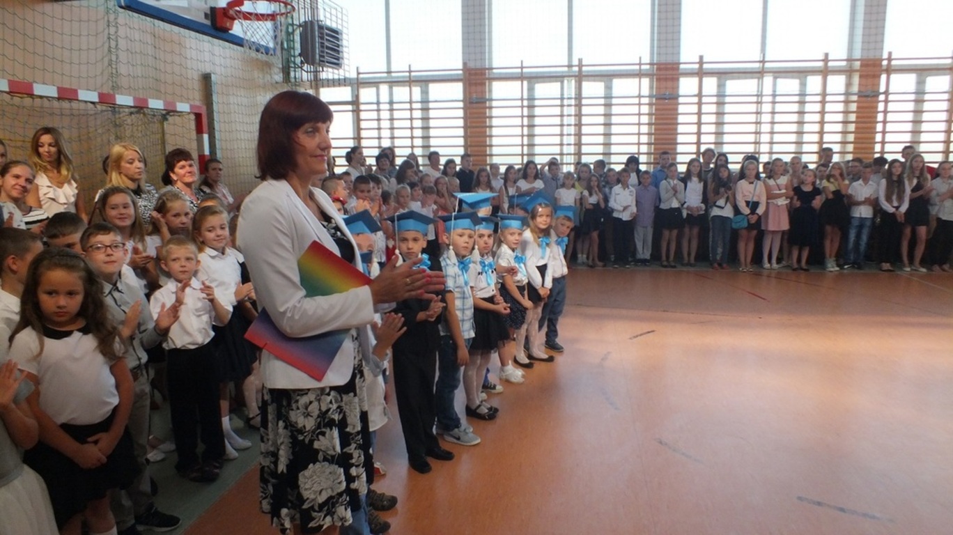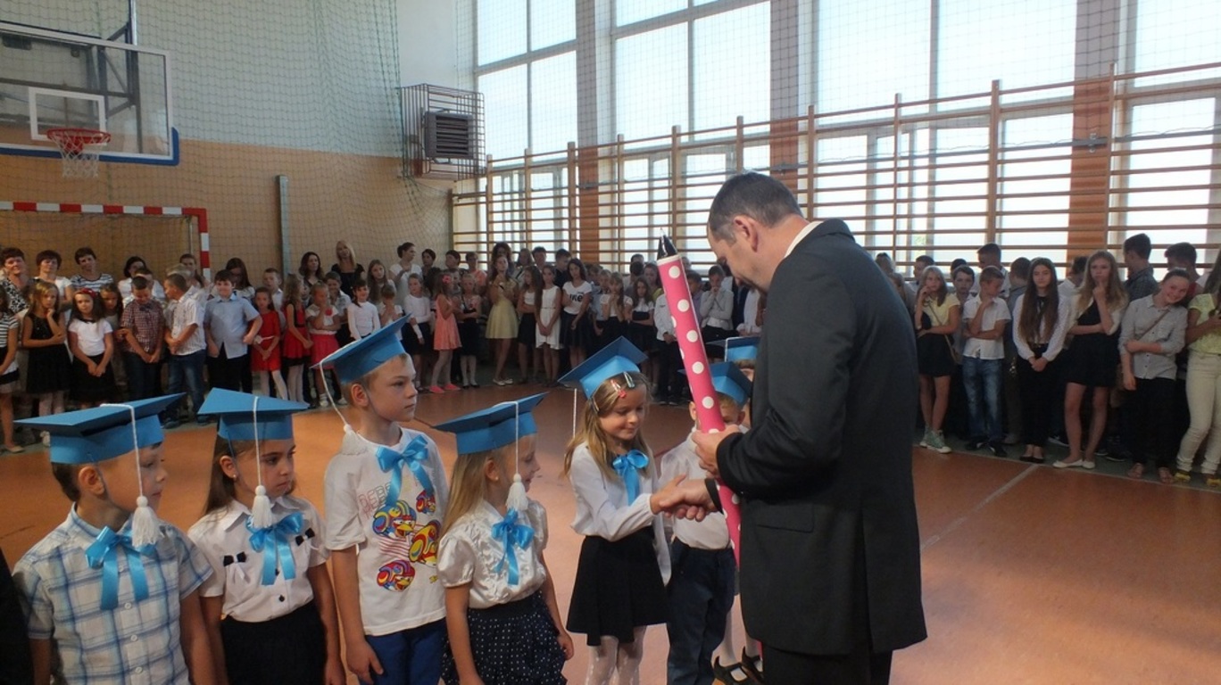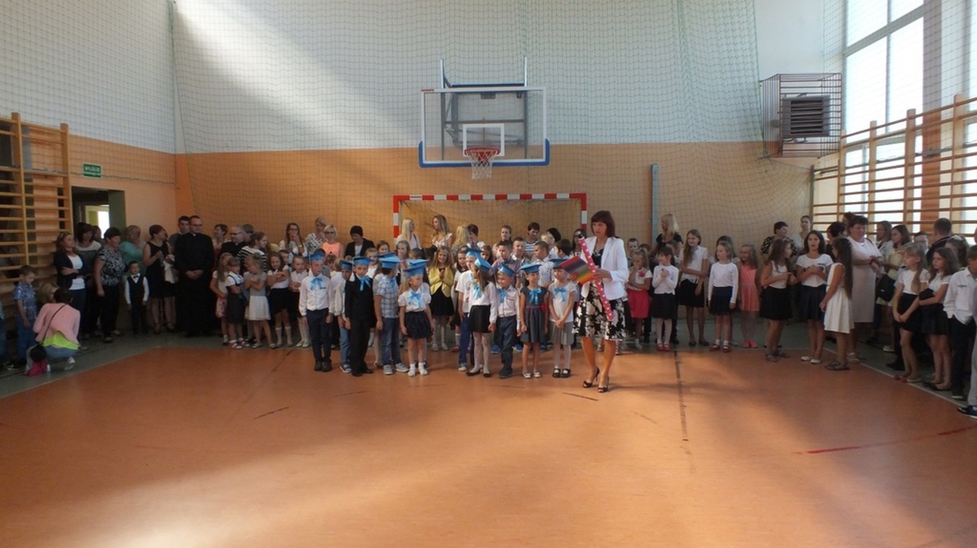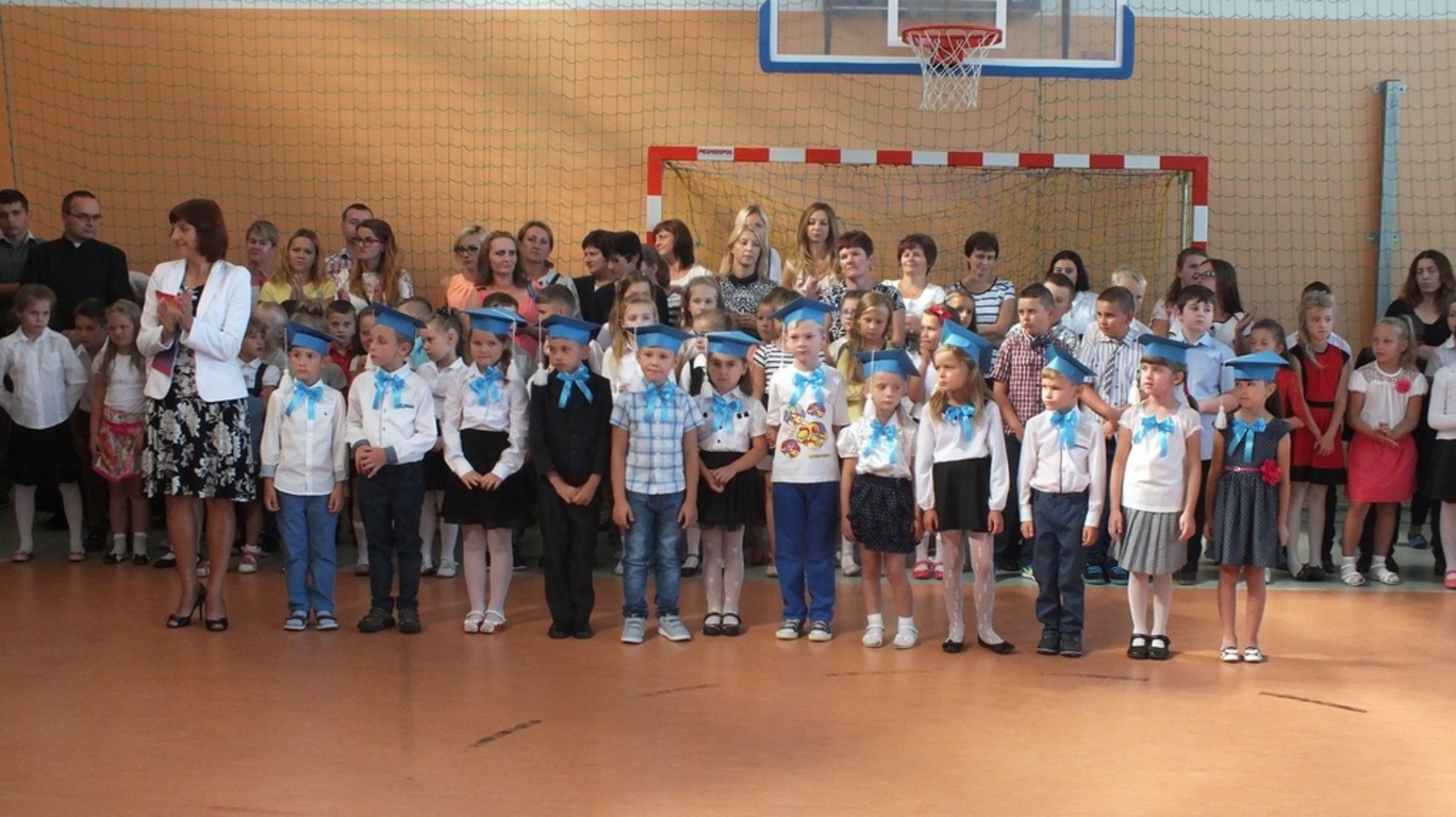 Z góry po raz pierwszy "patrzyła" na nas kamera ze szkolnego systemu monitoringu. Nagrywała uśmiechnietych ludzi, którzy z radością wrócili po wakacjach do szkoły. Głównymi bohaterami uroczystości byli pierwszoklasiści. Pięknie przystrojeni przez wychowawczynię p. Barbarę Stopę złożyli ślubowanie i zostali pasowani na uczniów naszej szkoły.