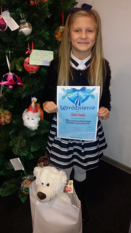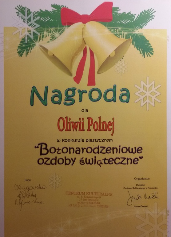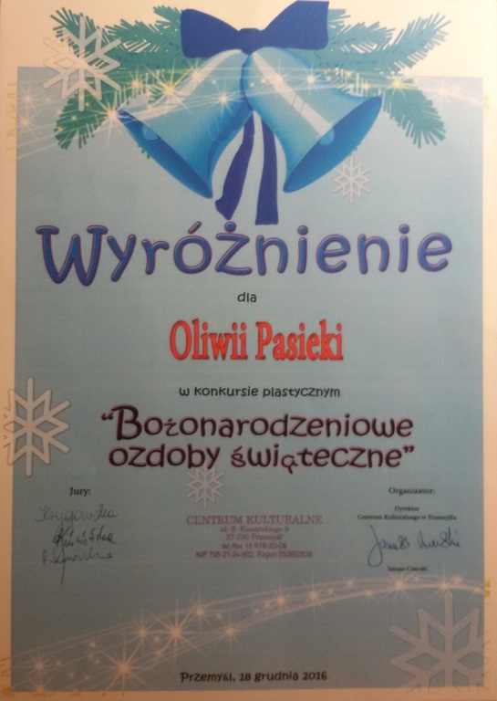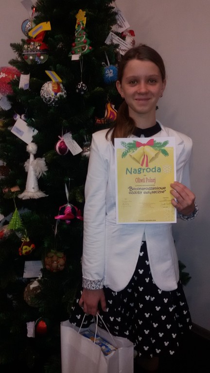 W okresie przedświątecznym, w grudniu uczniowie naszej szkoły zaproszeni zostali do dwóch konkursów plastycznych. Konkurs ,,Najpiękniejsza ozdoba choinkowa" zorganizowany został przez Muzeum Historii Miasta Przemyśla. Drugi - ,,Bożonarodzeniowe ozdoby świąteczne" zorganizowało Centrum Kulturalne w Przemyślu. Do konkursów zgłosiło się 19 uczniów naszej szkoły. Pracę można było wykonać w dowolnej technice, miała nawiązywać do tradycjnych wzorów, musiała być samodzielna, estetyczna i oryginalna. Za najpiękniejsze prace organizatorzy konkursu uznali ozdobę choinkową Oliwii Polnej z kl. 1 gimnazjum (nagroda) i bombkę Oliwii Pasieki z kl. 3a (wyróżnienie). Ogłoszenie wyników, wręczenie nagród i dyplomów odbyło się w sali widowiskowej CK w Przemyślu, na które uczennice przybyły wraz z opiekunami. Wszystkie prace uczniów eksponowane są w Muzeum Narodowym Ziemi Przemyskiej (Rynek 9) i w galerii CK w Przemyślu do 15 stycznia 2017 r.