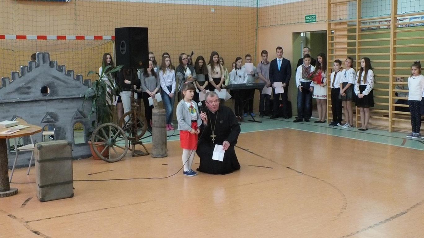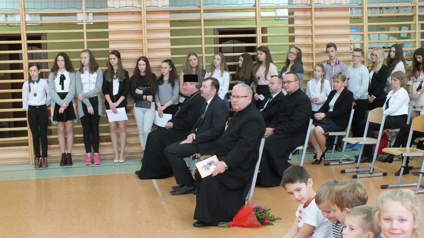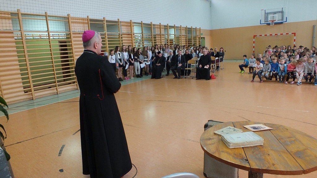 Między innymi o piłce nożnej ( której jest pasjonatem) rozmawiał z nami biskup pomocniczy archidiecezji przemyskiej ksiądz Stanisław Jamrozek, który odwiedził naszą szkołę 7 listopada. Na początku gościa przywitał dyrektor szkoły p. Stanisław Kalawski, ksiądz Bogusław Kot i ksiądz Bazyl Zbrocki z uczniami ( w imieniu własnym i całej parafii prawosławnej ). Następnie uczniowie kl. VII i gimnazjum zaprezentowali montaż słowno- muzyczny ( pod opieką ks. Władysława Hajduka). Wystąpiła także solistka - Ala Kalawska i chór złożony z uczniów klasy IV ( pod opieką p. Beaty Grabas). W krótkim monologu Łukasz Łogin przybliżył biskupowi postać patrona szkoły p. Bolesława Orzechowicza. Miłym akcentem spotkania było wręczenie gościowi nowego tomiku poezji księdza Władysława Hajduka ( księdzu Władysławowi serdecznie gratulujemy). Ze słów biskupa najbardziej zapamiętamy jego prośbę o to, by sobie nawzajem pomagać....i to ,że doceniając pracę i czas służby w parafii ( 40 lat! ) ks.Bazyla Zabrockiego nazwał go... patriarchą Kalnikowa.