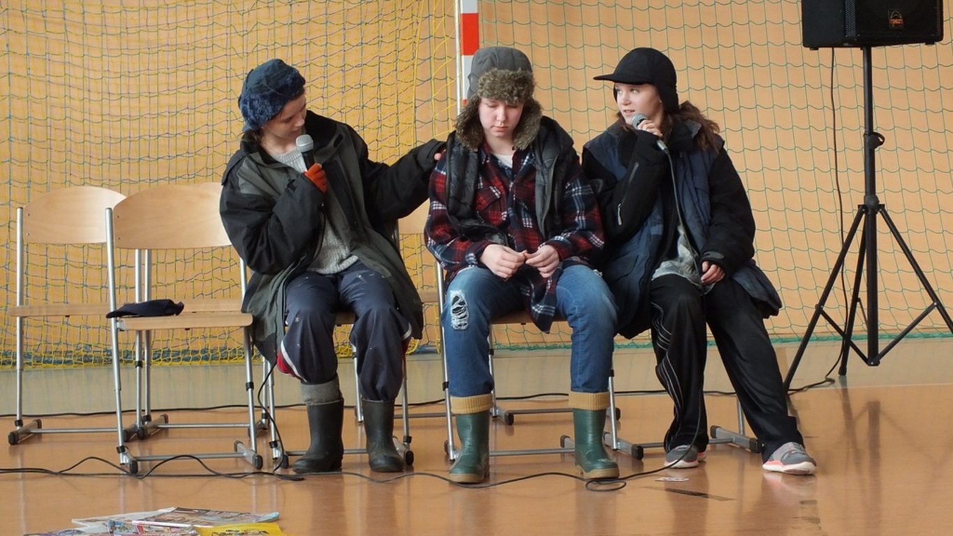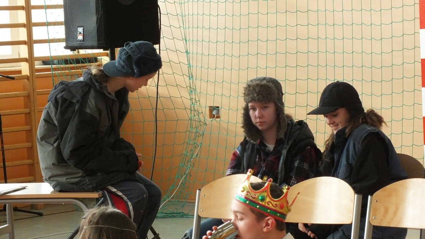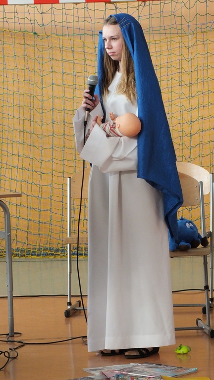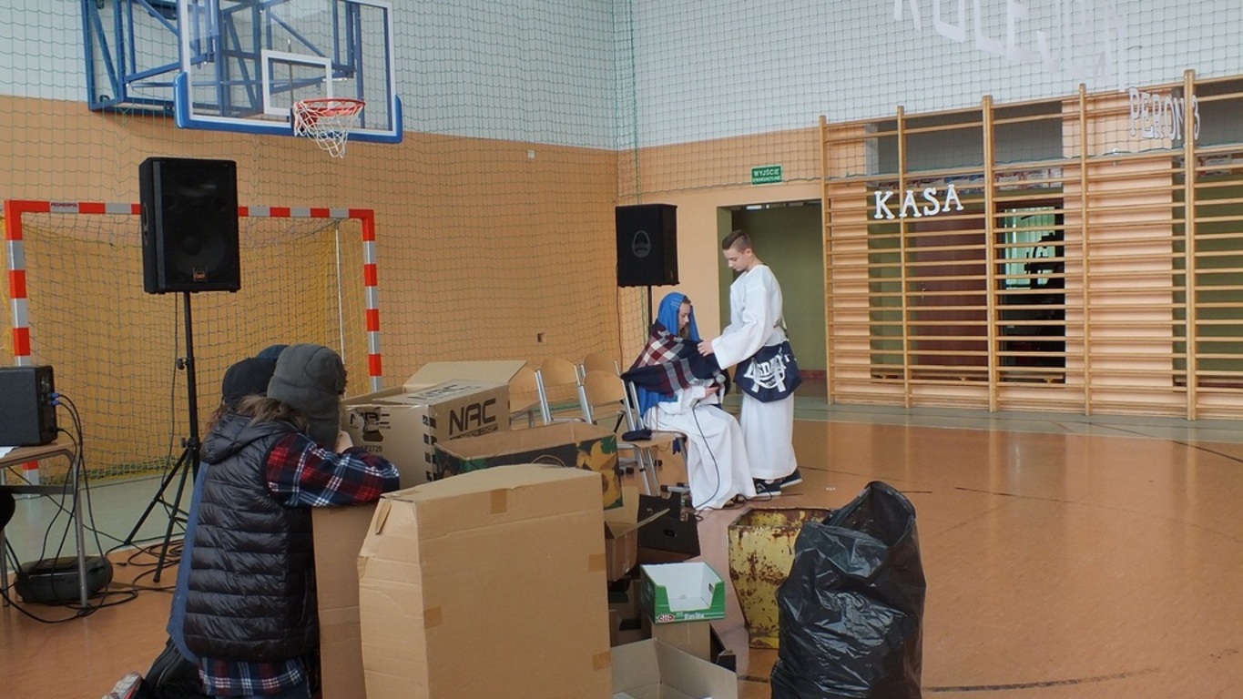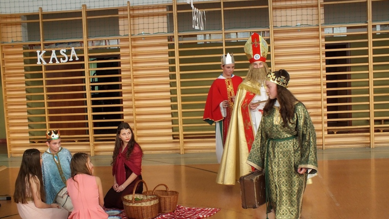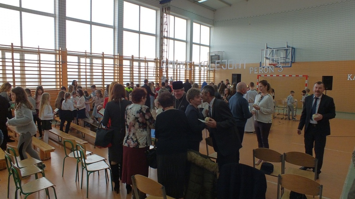 Blisko godzinę teatru na najwyższym poziomie zaprezentowali publiczności uczniowie klasy II gimnazjum. Bezdomni z dworca kolejowego ( Oliwia Polna, Kamila Polna, Gabrysia Bundyra ) doświadczyli cudu Narodzenia Pańskiego i odmienili swoje życie. Bezdomność w sztuce rozumiana była jako życie bez Boga. Na szczęście On może urodzić się każdego dnia i w każdym miejscu. Za kolędowanie ze wspaniałym skutkiem" wzięli" się czwartoklasiści ( znakomity chór ), dziewczyny z II gimnazjum i uczniowie przygotowani przez księdza Bazyla Zabrockiego. Wystąpiły także dwie solistki : Ala Kalawska i Kalina Pekaniec...trzy solistki bo swoim występem niespodziewanie zaszczyciła nas także p. Maria Świdrak- dyrektor Banku w Stubnie ( nasz gość )- dziękujemy Pani. Dyrektor szkoły p. Stanisław Kalawski w asyście czterech księży ( rzymskokatolickich, prawosławnego i greckokatolickiego) złożył wszystkim życzenia i rozpoczął dzielenie się opłatkiem i prosforą. A wszystko to zdarzyło się 5 stycznia 2018 r. podczas tradycyjnego, świątecznego spotkania w naszej szkole. I ja tam byłem , uszka jadłem i barszcz piłem...Dziękujemy wszystkim zaproszonym gościom za przybycie, dobre słowo i...cukierki. Dziękujemy nauczycielom ( p. Beacie Grabas, p. Swietłanie Szczurek, ks. Bazylowi Zabrockiemu, ks. Władysławowi Hajdukowi i p. Bogusławowi Kosztyle ) za przygotowanie cześci artystycznej. Dziękujemy Radzie Rodziców za Wigilijne potrawy. W poniedziałek 8 stycznia szkoła w Kalnikowie jest zamknięta! Wesołych Świąt!