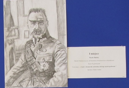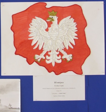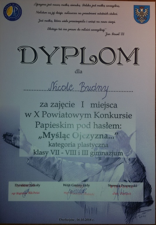 16 października 2018 r. w Szkole Podstawowej w Drohojowie odbył się X Powiatowy Konkurs Papieski, zorganizowany z okazji XVIII Dnia Papieskiego oraz 100. Rocznicy odzyskania przez Polskę Niepodległości, pod hasłem: ,,Myśląc Ojczyzna...". Konkurs przebiegał w trzech kategoriach: recytatorkiej, wokalnej i plastycznej. Nasi uczniowie uczestniczyli w kategorii plastycznej. Na konkurs należało wykonać pracę w postaci plakatu lub rysunku, nawiązującą do 100. Rocznicy odzyskania przez Polskę Niepodległości, przedstawiającą ważne wydarzenie z historii Polski, postacie historyczne lub bohaterów narodowych. Prace oceniane były w dwóch przedziałach wiekowych: kl. 4-6 szkoły podstawowej i kl. 7-8 szkoły podstawowej oraz 3 gimnazjum. W kategorii uczniów młodszych II miejsce zdobyła Maja Chamik z kl. 4 za wykonanie pracy pt. ,,Tadeusz Kościuszko". W kategorii klas starszych III miejsce otrzymała uczennica kl. 7 Ewelina Cupak za pracę pt. ,,Godło Polski". Zaszczytne I miejsce zostało przyznane uczennicy Nicole Budny z kl. 3 gimnazjum, która wykonała pracę pt. ,,Cześć i chwała dla bohatera, którego naród pochwala". Serdecznie dziękujemy wszystkim uczestnikom konkursu za prezentowanie naszej Szkoły. Gratulujemy i życzymy dalszych sukcesów.