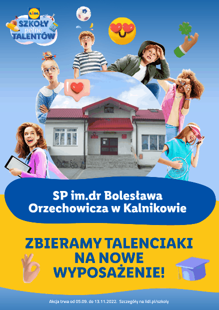 Szkoły Pełne Talentów Drodzy Uczniowie, Szanowni Rodzice i wszyscy sympatycy Naszej szkoły. Ogłaszamy, że Szkoła Podstawowa w Kalnikowie dołączyła do akcji Lidla i zbieramy „Talenciaki”. Szczegóły akcji na https://www.lidl.pl/c/szkoly/s10012469