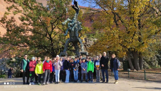 Legendarny król Krak ( założyciel Krakowa) musiał znaleźć sposób na smoka ( wawelskiego) ,który pustoszył miasto. Nie pomogli silni,mocarni rycerze. I dopiero Szewczyk dawniej zwany Skubą sprytem pokonał smoka ( owca, siarka, Wisła , bum). Pomysł,sposób ,mądrość ,a nie siła. Pamiętajcie o tym walcząc z różnymi smokami. 13 października byliśmy ( kl. IV, V i VI) w jaskini tego smoka . Widzieliśmy także jak zionie ogniem. Nie baliśmy się,bo był z nami Szymon Skiba ,a on ma chyba coś wspólnego z tamtym Skubą.Potem cała wycieczka piła wodę,ale nie z Wisły ,tylko z parku wodnego . Na szczęście nie wypiliśmy całej i nikt nie pękł. W Krakowie są pewne obowiązki…..i my te obowiązki, wraz p. Marią Dacyk, p. Leokadią Piękoś i p. Bogusławem Kosztyłą, wypełniliśmy. A mianowicie,wysłuchaliśmy hejnału z Wieży Mariackiej ( oczywiście o godzinie 12.00). Zwiedziliśmy Rynek( z Sukiennicami w roli głównej ,chociaż rzeźba dużej głowy, do której można wchodzić też zrobiła wrażenie). Na Rynku jedliśmy także „ obowiązki” ,czyli obwarzanki.Byliśmy na Wawelu ( tu obowiązek dotknięcia dzwonu Zygmunta). Nie zabrakło też wizyty na Kopcu Kościuszki. A może by tak pod szkołą usypać kopiec?