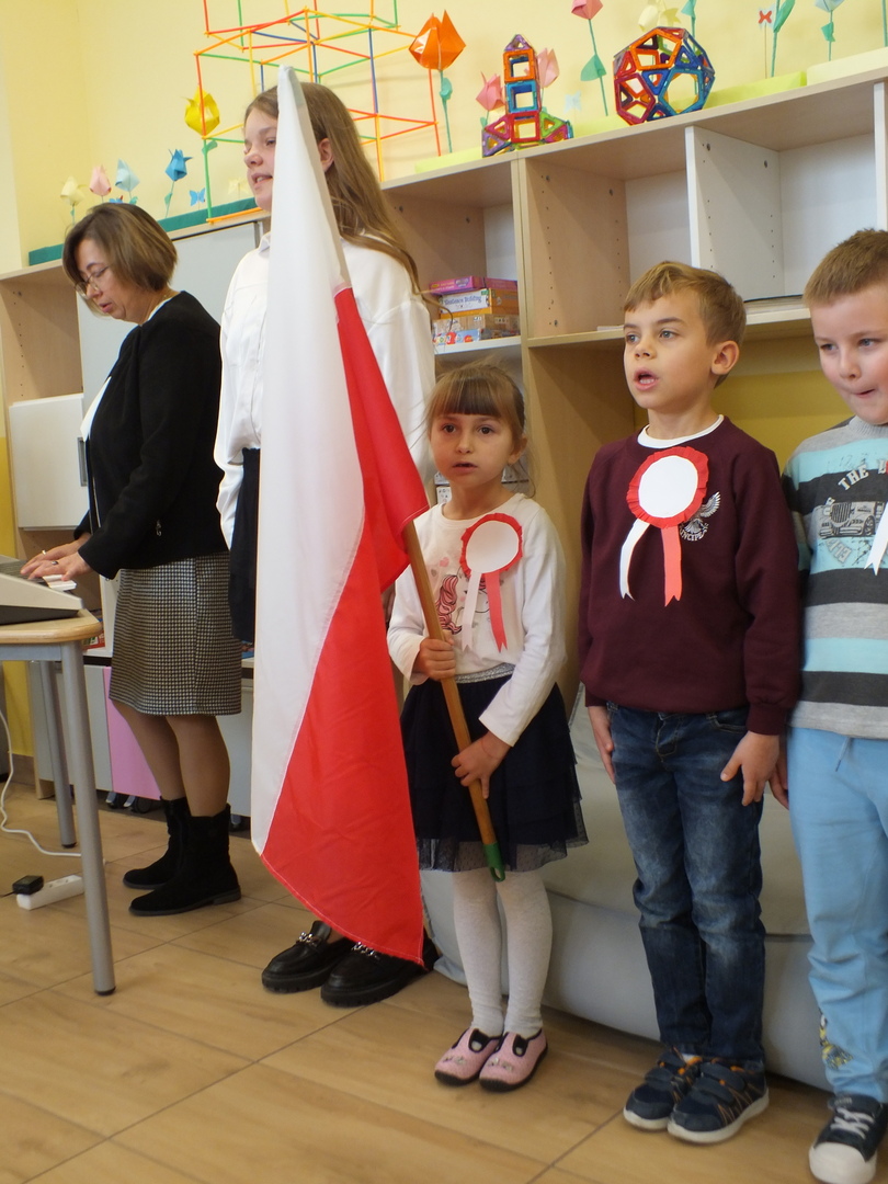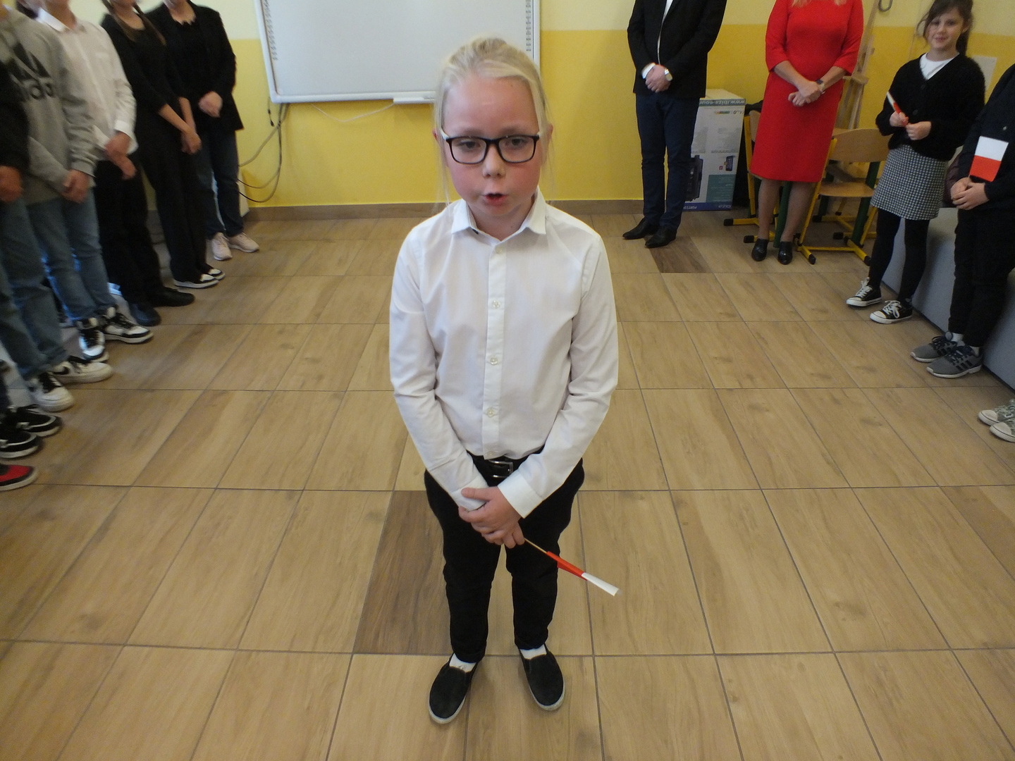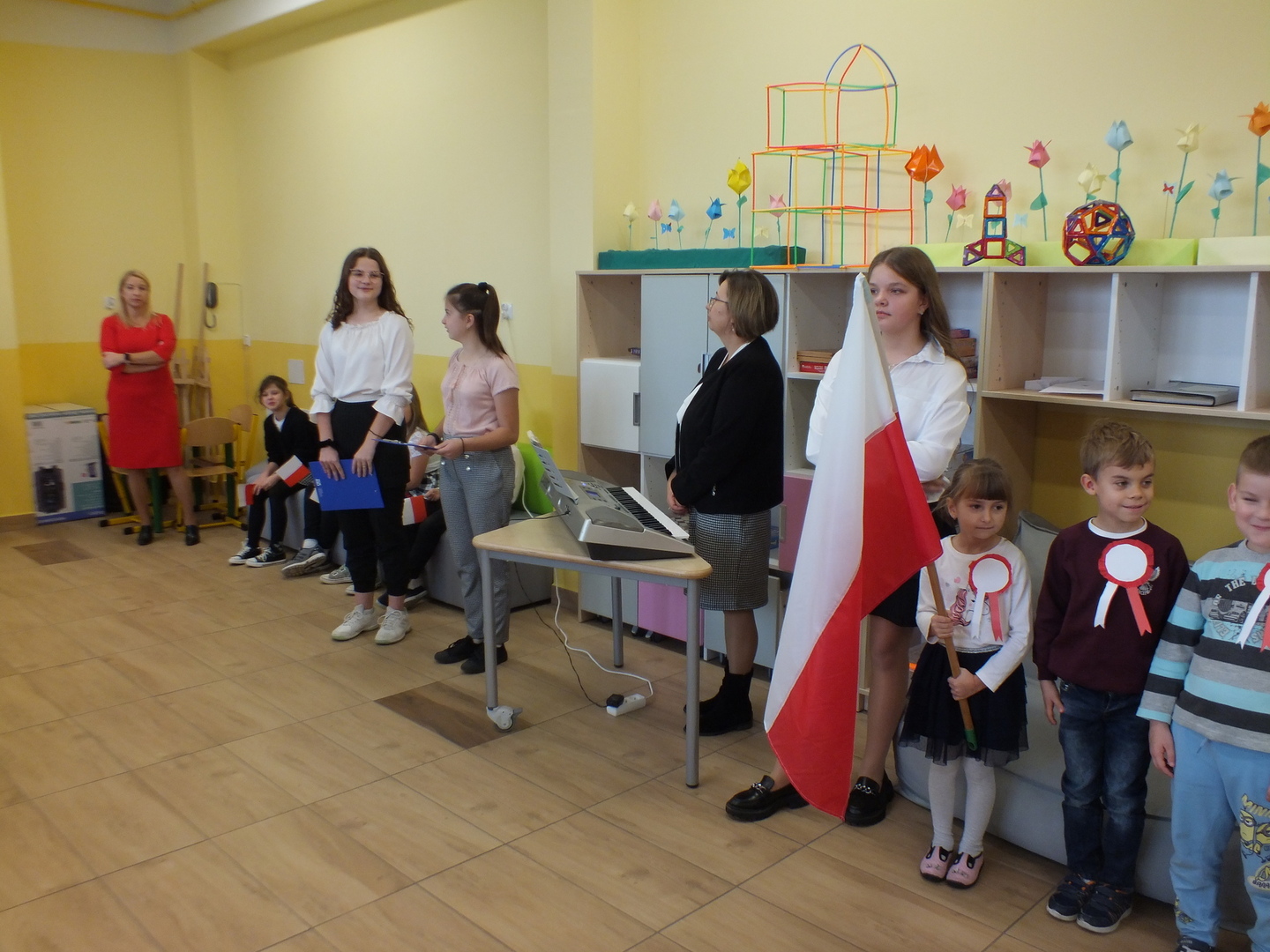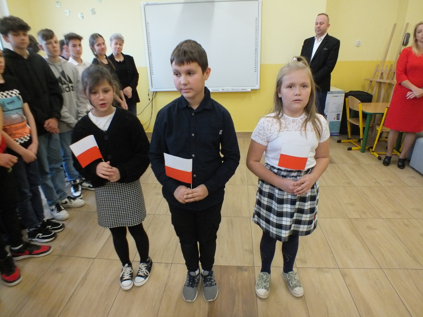 Piątek. Godzina 11. 11. Postawa na baczość. Flagi, herb, kotyliony, patrioyczne wiersze, pieśni to wszystko podczas szkolnych obchodów Dnia Niepodległości.
