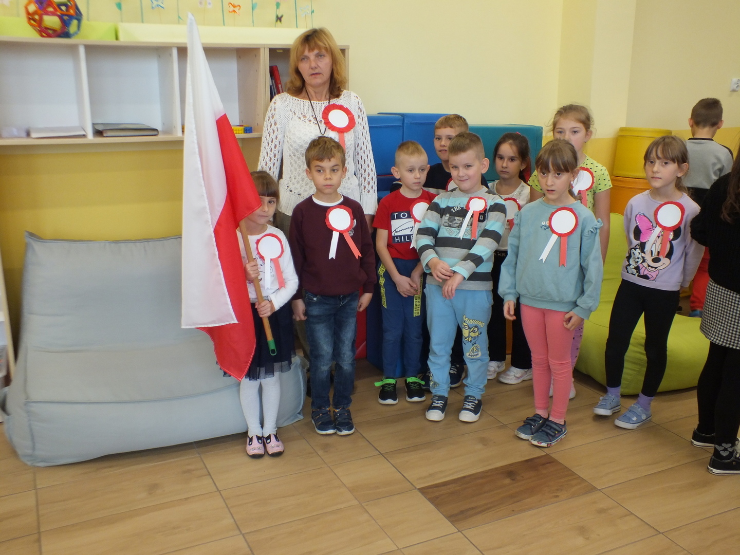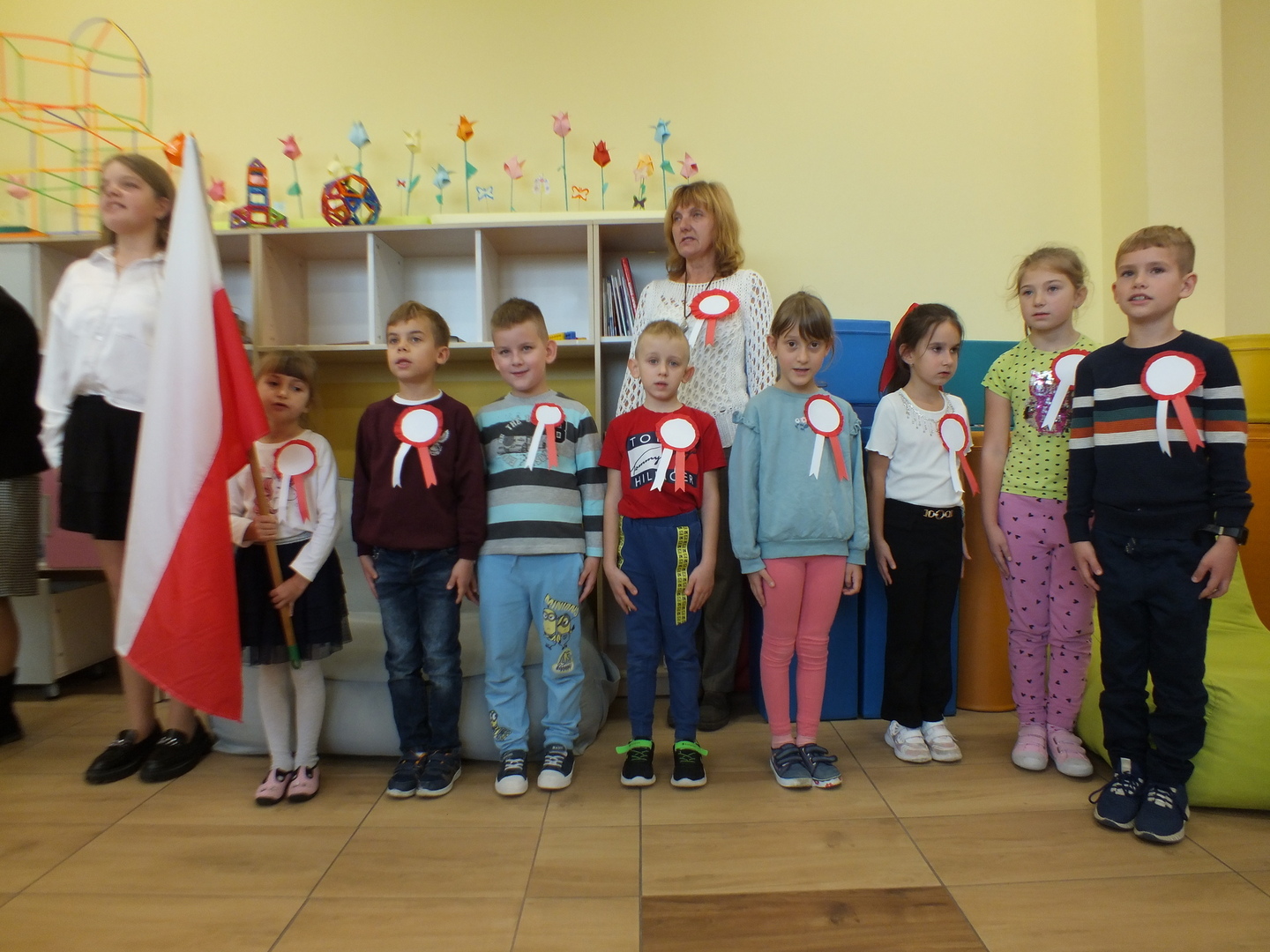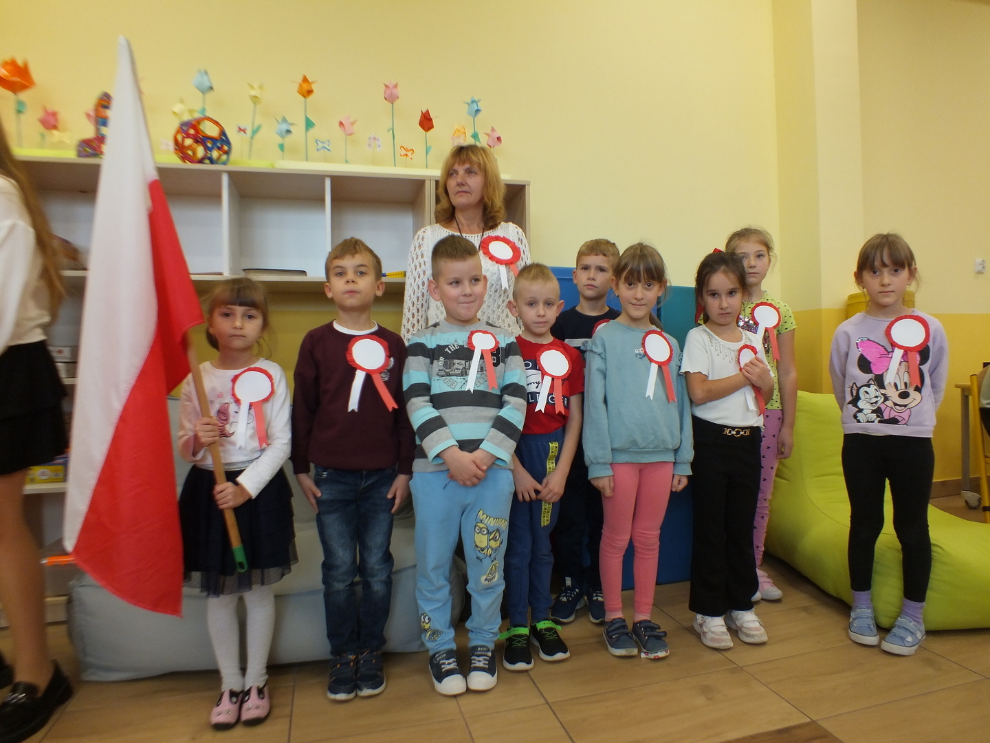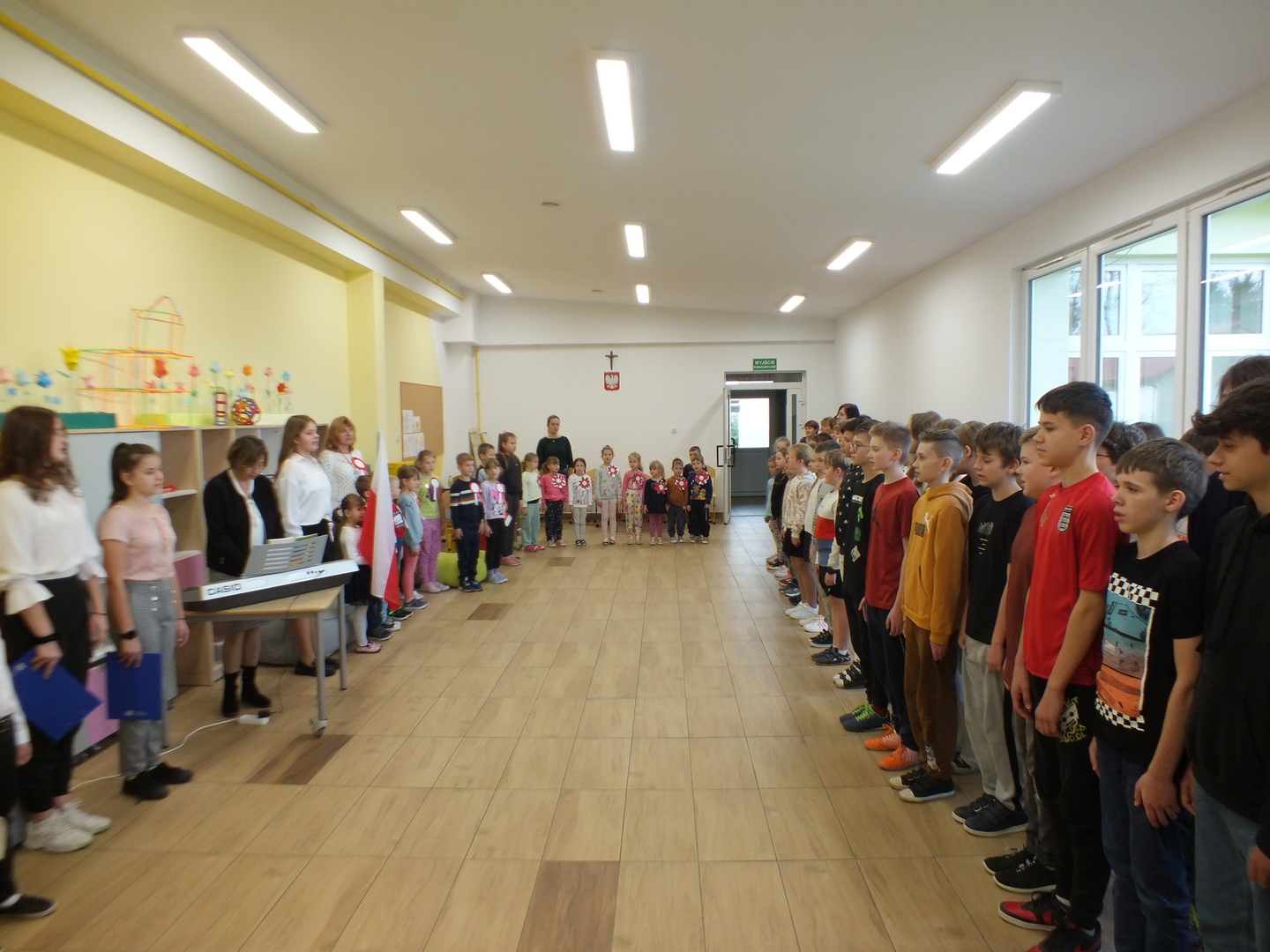Piątek. Godzina 11. 11. Postawa na baczość. Flagi, herb, kotyliony, patrioyczne wiersze, pieśni to wszystko podczas szkolnych obchodów Dnia Niepodległości.