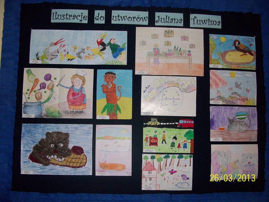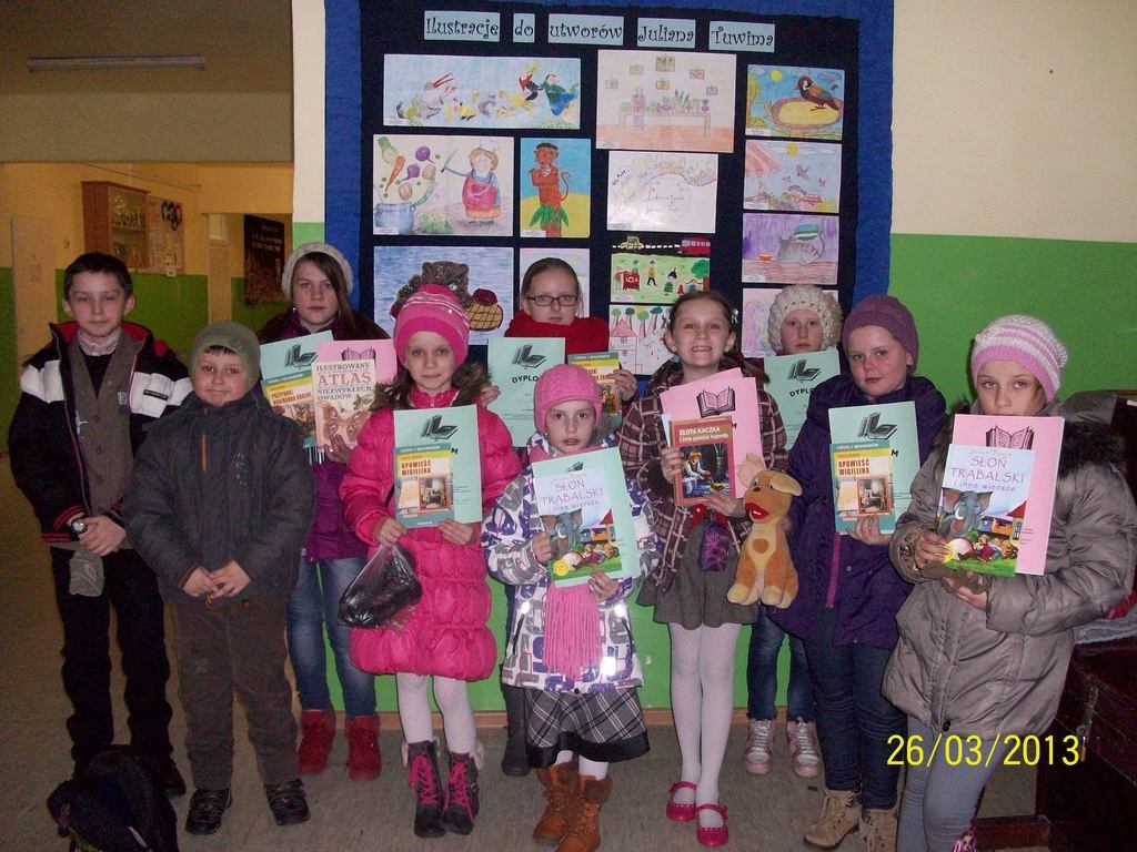 Z okazji obchodzonego właśnie Roku Tuwima, 26 marca w szkole w Stubnie odbył się gminny konkurs recytatorski i plastyczny, poświęcony twórczości tego poety. Konkurs oceniany był w dwóch kategoriach wiekowych (kl. I - III i kl. IV - VI). W części plastycznej wzięło udział 11 uczniów naszej szkoły, a nagrodzone zostały prace: Patrycji Dańko - II miejsce i Kamila Wolańskiego - III miejsce oraz w drugiej kategorii wiekowej Dominiki Ścirko - I miejsce i Małgorzaty Soroki - II miejsce. Ponadto jury wyrózniło prace Gabrieli Bundyry i Amelii Grabas. W części recytatorskiej wystąpiło 10 uczniów naszej szkoły. Najlepsi okazali się: Kamila Polna i Oliwia Polna (bliźniaczki), które zajęły ex aequo I miejsce oraz Łukasz Łogin, który zajął II miejsce. W starszej grupie wiekowej I miejsce zajęła Małgorzata Soroka z kl. V. Wyróżnieni zostali uczniowie: Wiktoria Balandyk, Joanna Soroka, Paweł Łogin i Justyna Fałta. Wszyscy nagrodzeni i wyróżnieni otrzymali dyplomy i nagrody książkowe, zaś pozostali uczestnicy konkursu dyplomy z podziękowaniem za udział. Wszystkim gratulujemy i zapraszamy do udziału w kolejnych konkursach, zaś pani Renacie Wiątek, pracownikowi biblioteki szkolnej dziękujemy za zorganizowanie konkursu i serdeczne przyjęcie uczniów naszej szkoły.