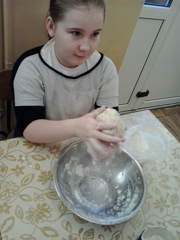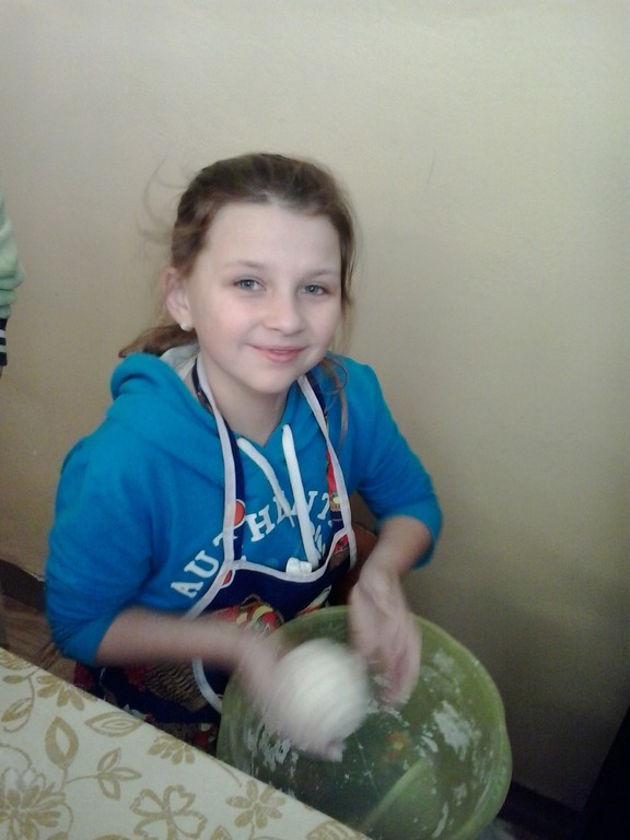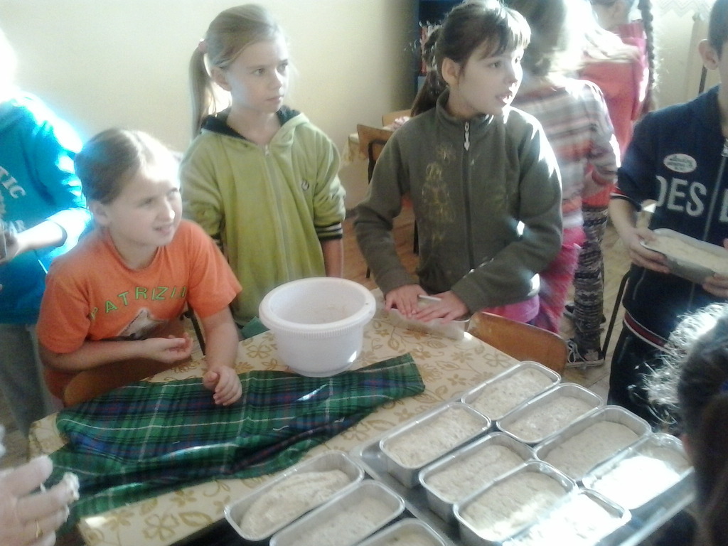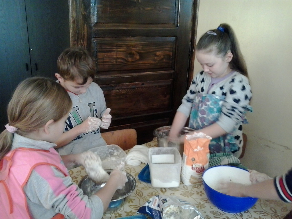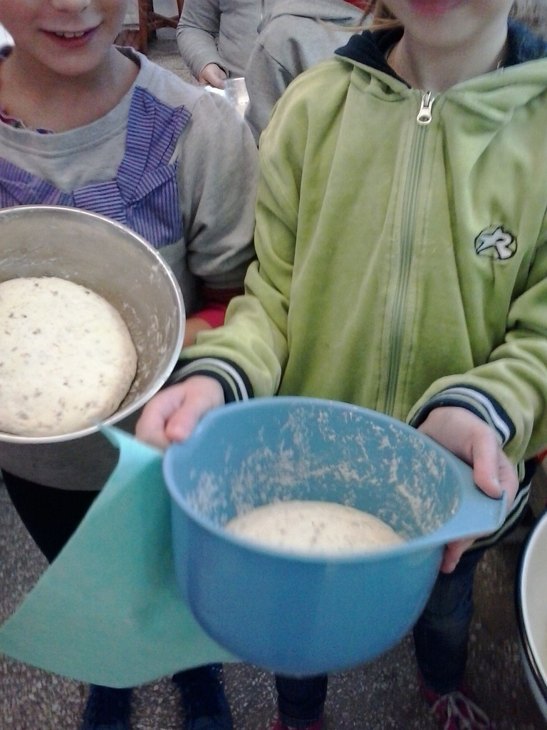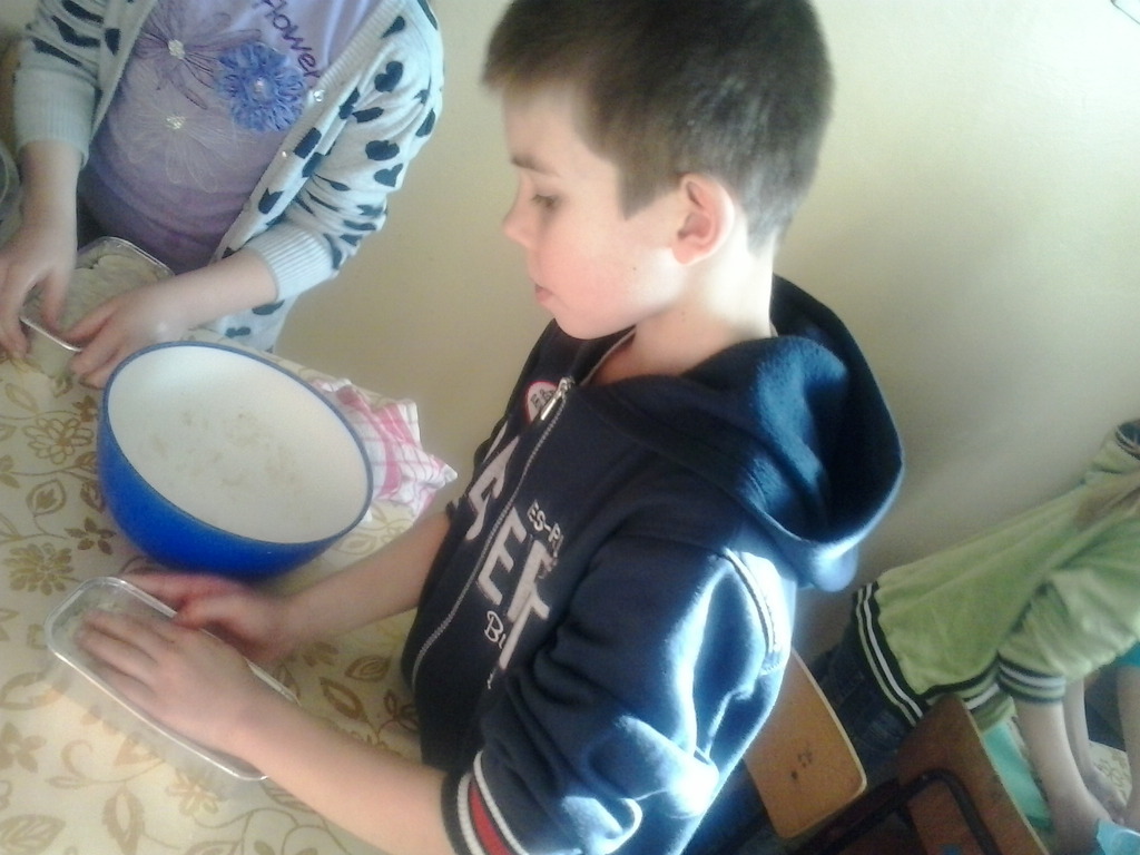 ...jeszcze nam uczniów IV klasy tu potrzeba. Stawili się 17 grudnia jak jeden mąż, umyli ręce, zakasali rękawy i... zagniatali, zagniatali, zagniatali chleb przez całą pierwszą lekcję. Trochę się lepiło do rąk, ale z pomocą pani Marysi Dacko udało się zagnieść ciasto chlebowe! Czy dwie lekcje to długo? Właśnie tyle potrzeba, aby ciasto podwoiło swoją objętość. Następną lekcję leżakowało w foremce, kolejną piekło się w piekarniku, a jeszcze jedną lekcję stygło. Ile lekcji potrzeba, aby upiec chleb?
